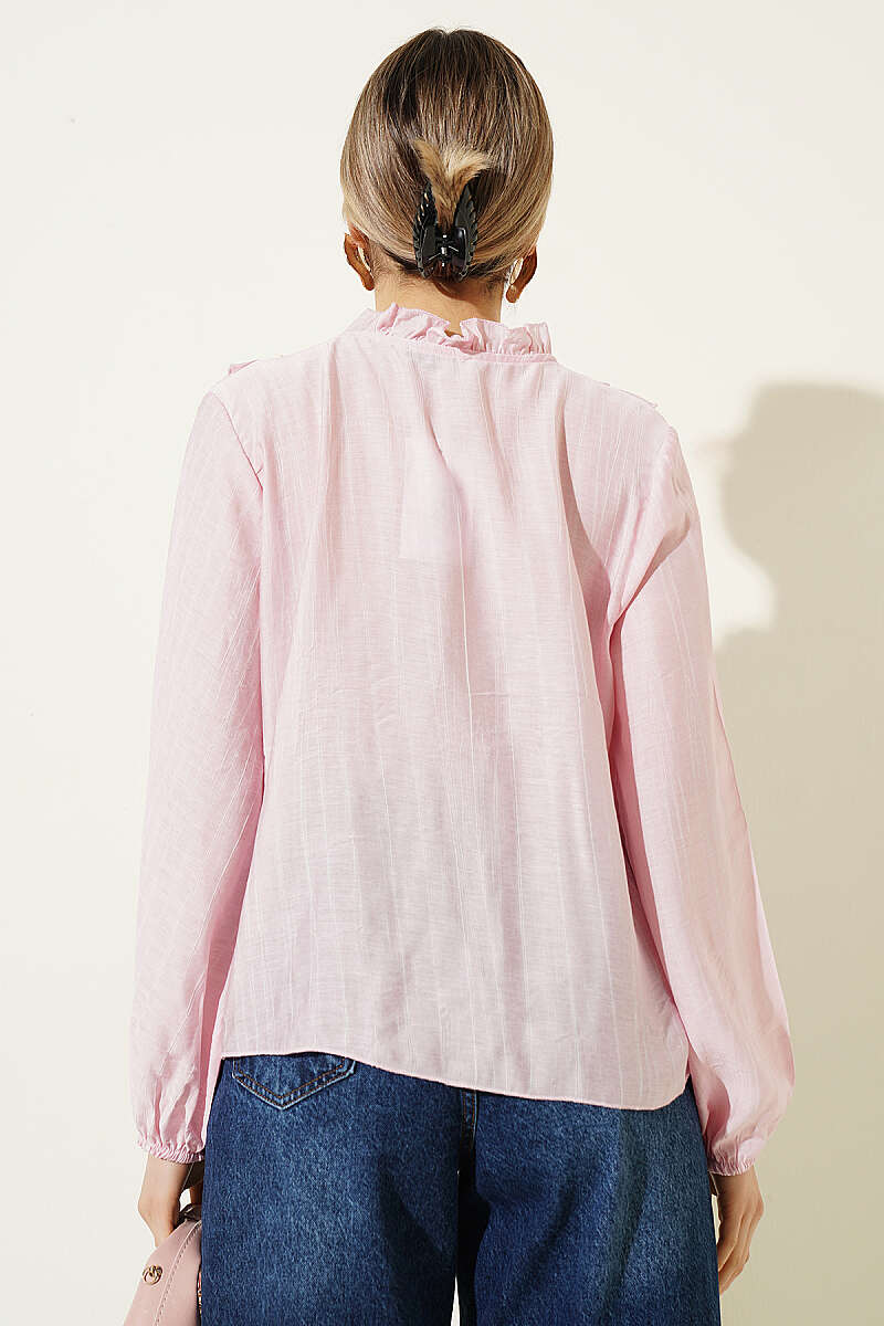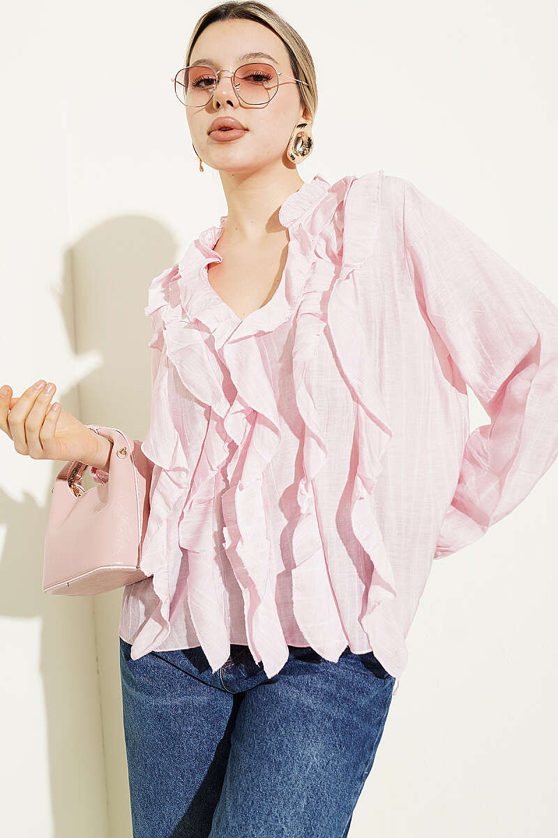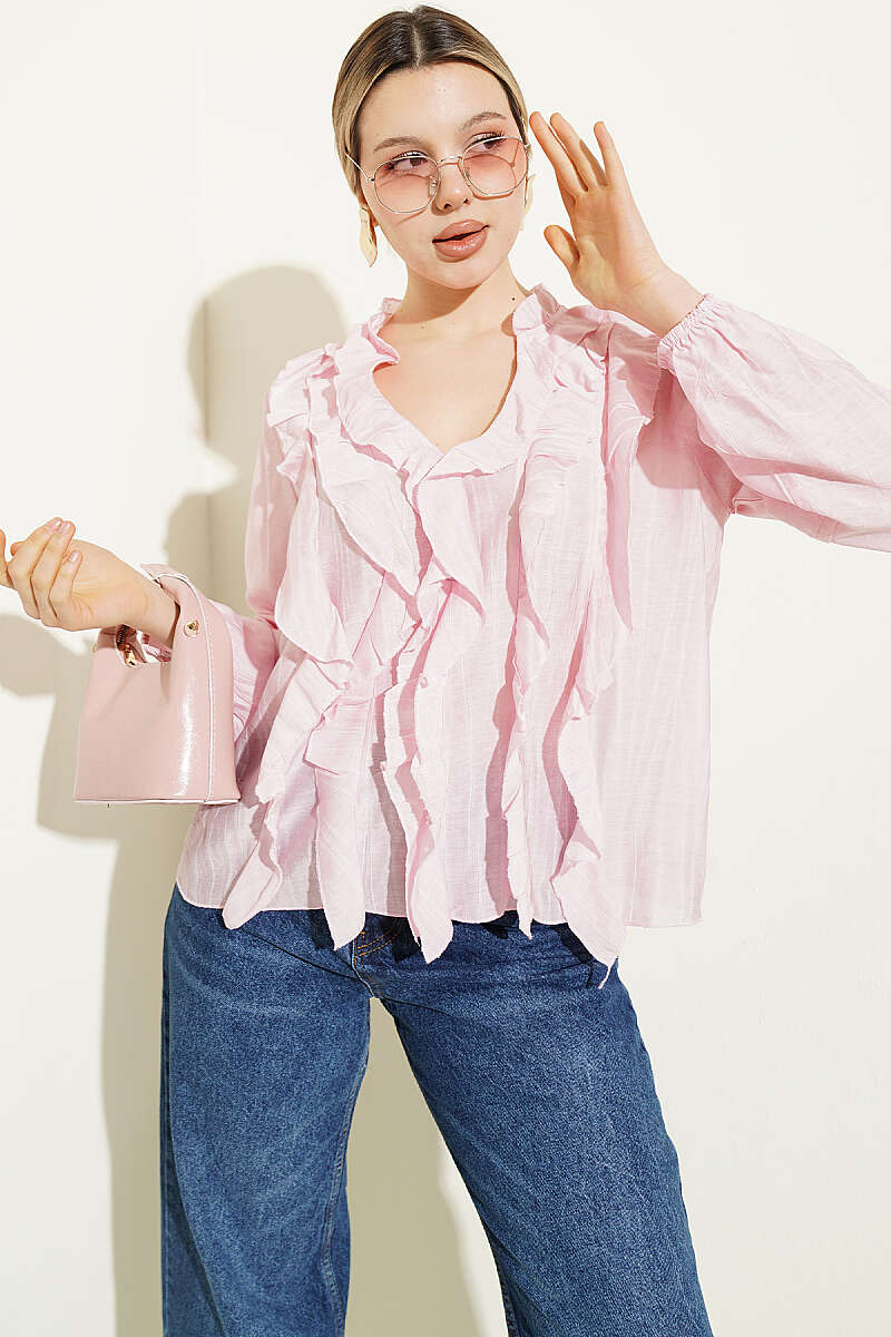 V Yaka Çizgili Fırfırlı Bluz Pembe