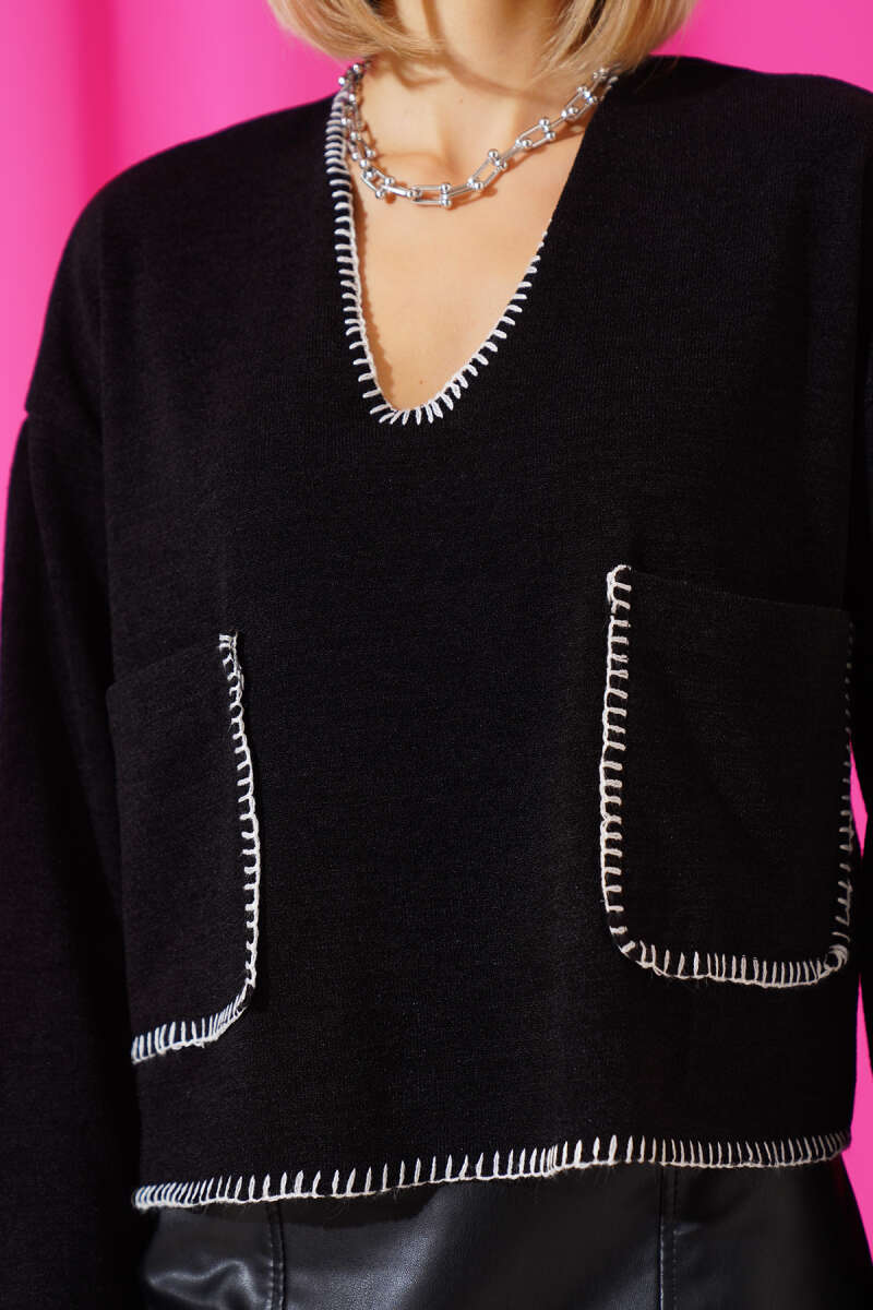 V Yaka Çoban Dikiş Bluz Siyah