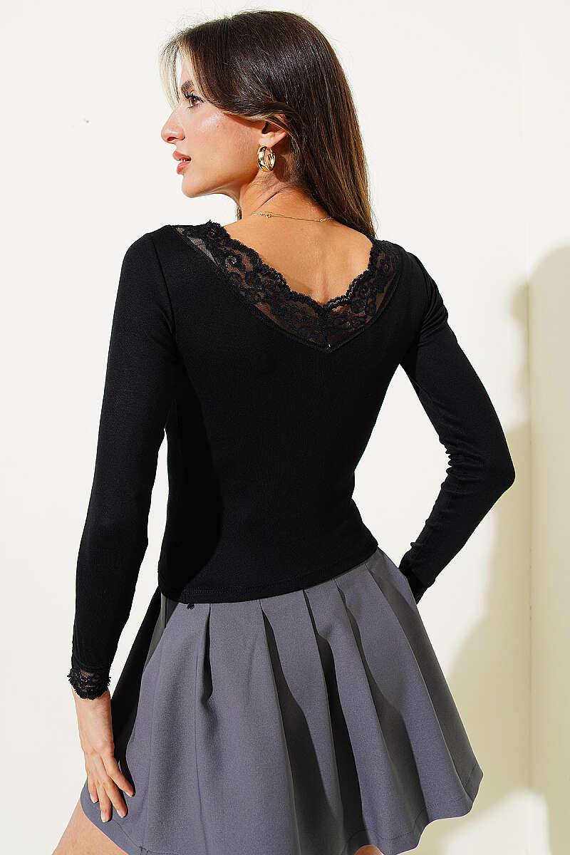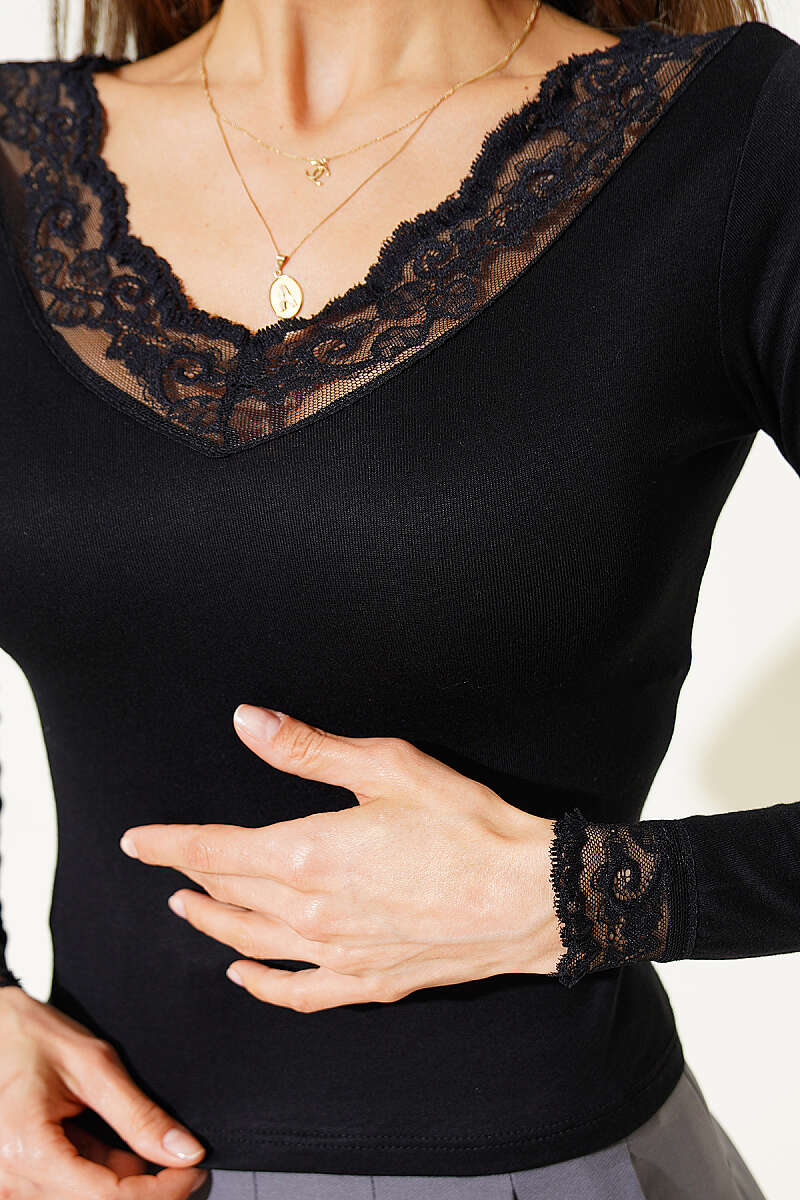 V Yaka Dantel Detaylı Bluz Siyah