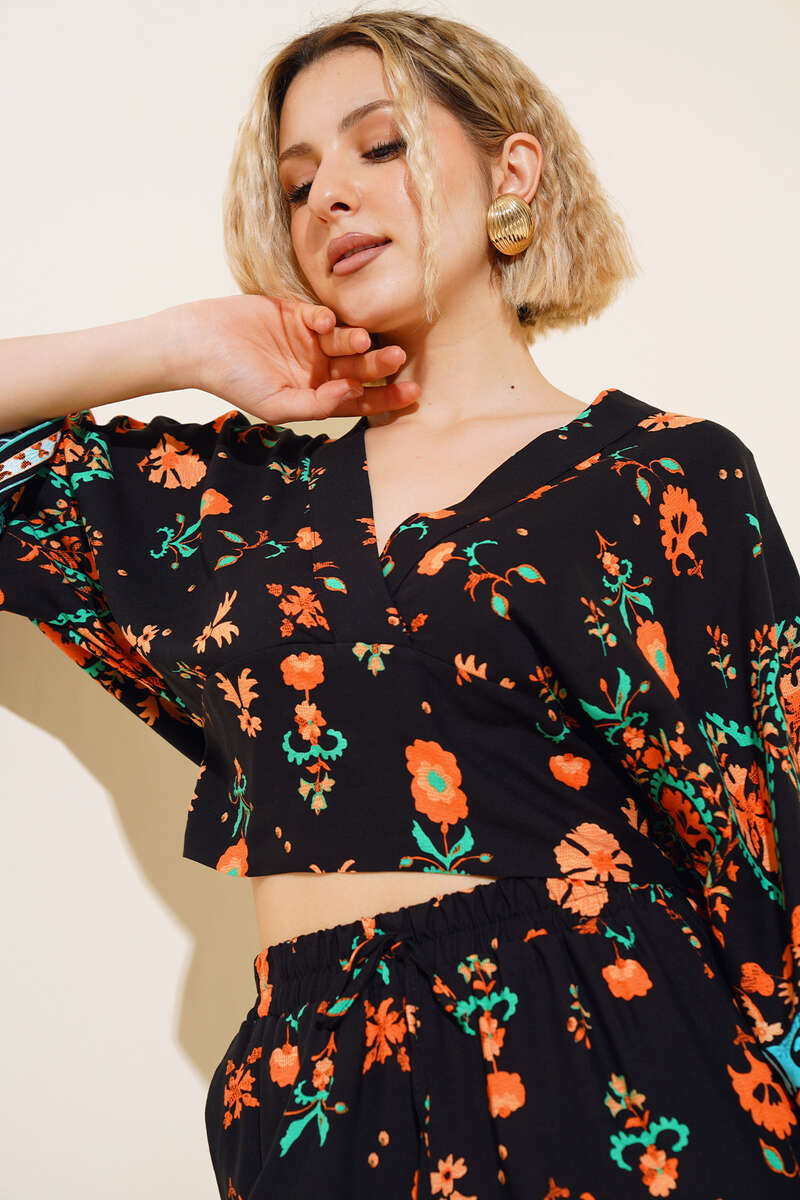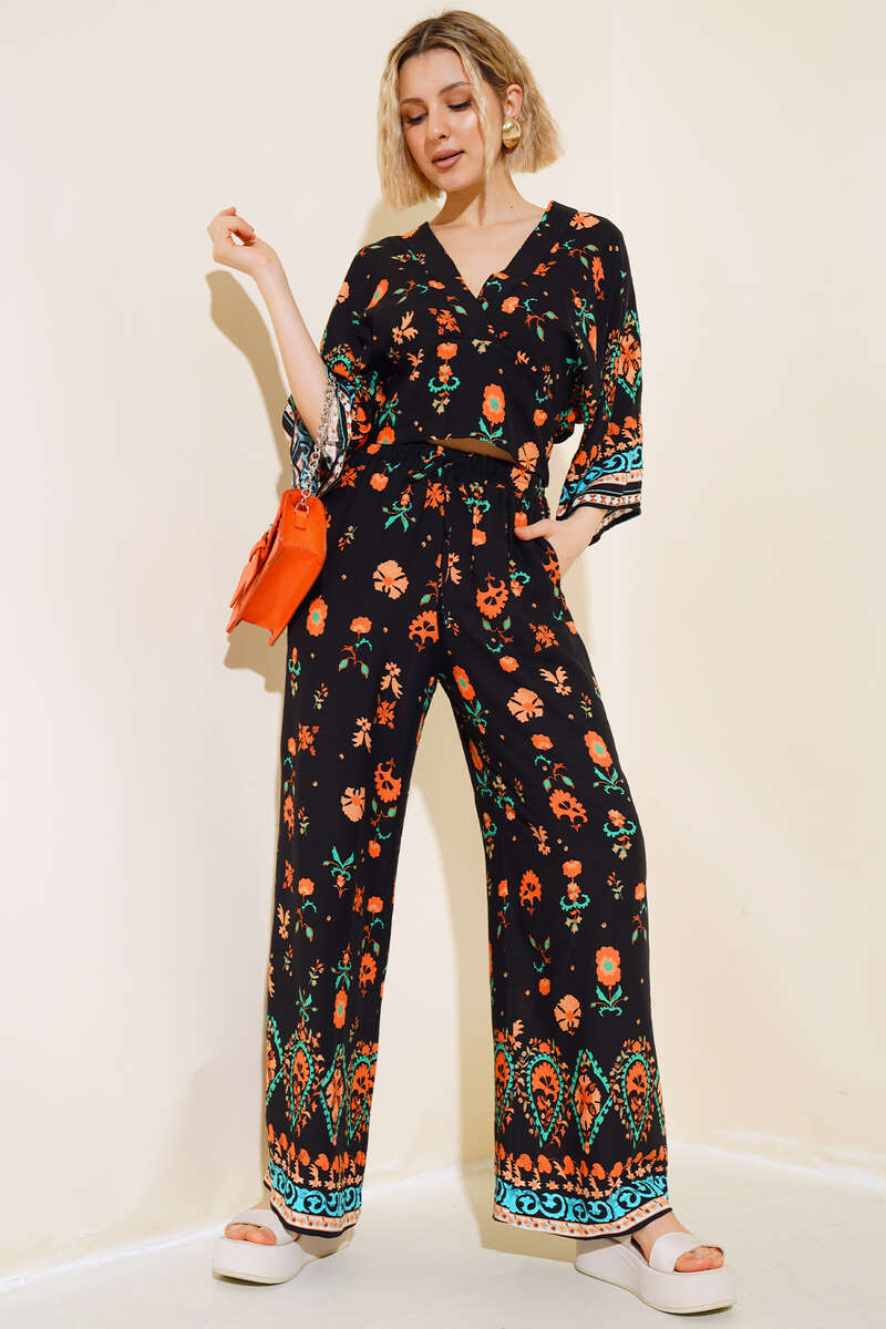 Yeni sezon ikili takımımız şık tarzıyla favoriniz olacak. Crop modelimiz v yakadır. sırtı dekolteli olup, ip bağcık detaylıdır. Yarasa koldur. Crop modelimizin arka beli lastiklidir. Pantolonumuzun beli lastiklidir. Cepli modeldir. Bol paçadır. Sade ve şık duruşuyla favoriniz olacak.