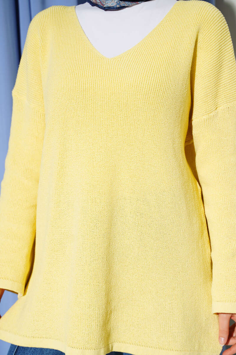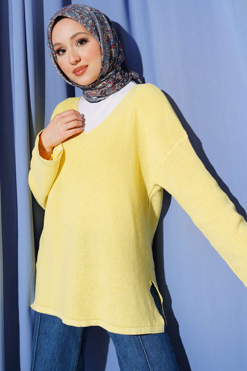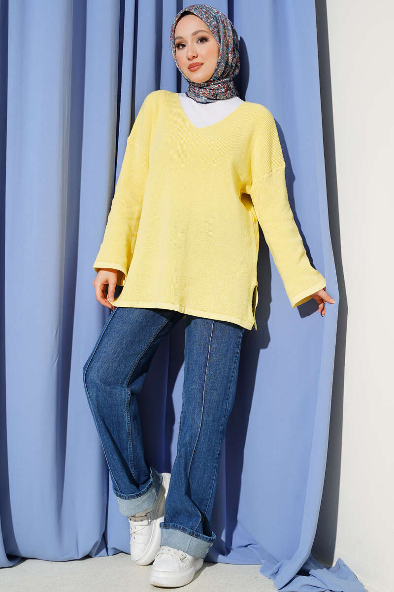 V yaka tasarımıyla hem şık hem de konforlu bir kullanım sunan temel bir parçadır. Yumuşak triko dokusu ve salaş kesimi sayesinde vücut hatlarını zarifçe örterken, yanlardaki küçük yırtmaç detayları hareket özgürlüğünü artırır. Minimalist stiliyle farklı pantolon ve taytlarla kolayca kombinlenebilen bu tunik, günlük gardırobunuzun vazgeçilmez bir tamamlayıcısı olacaktır.