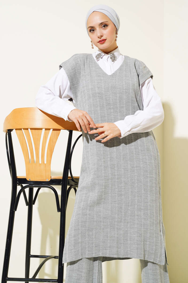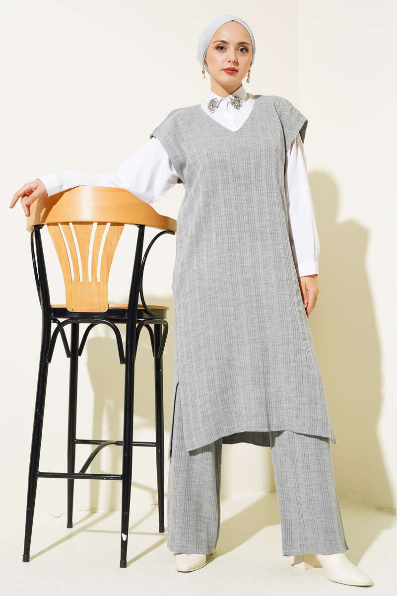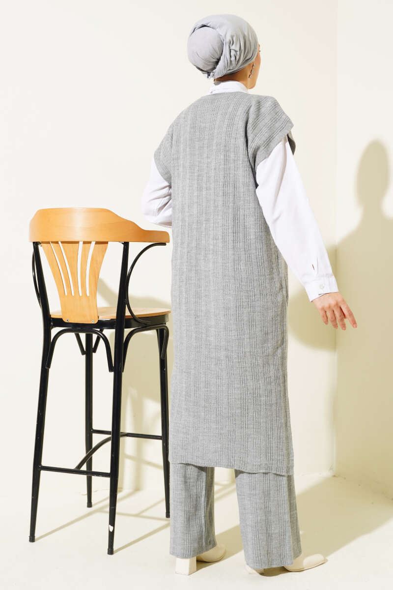 Balon Kol Balıkçı Yaka Triko İkili Takım Gri