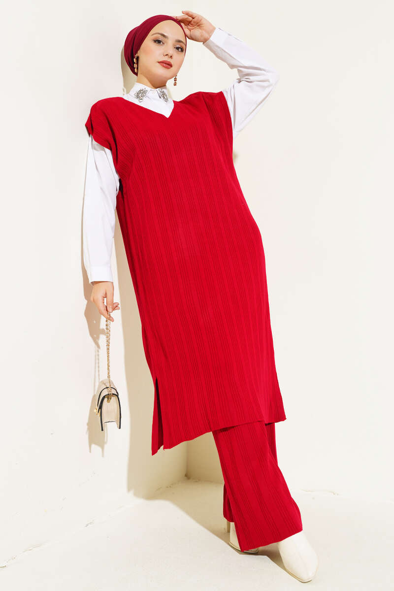 Kabartma Şeritli Taşlı Triko İkili Takım Nefti
