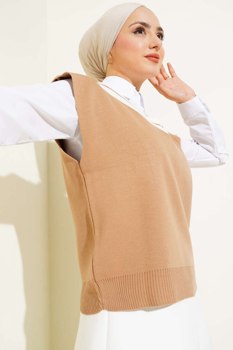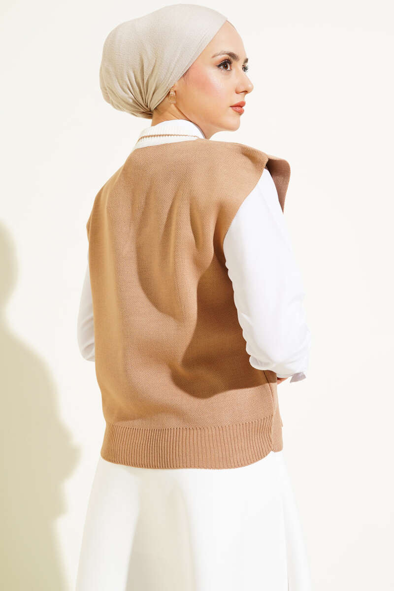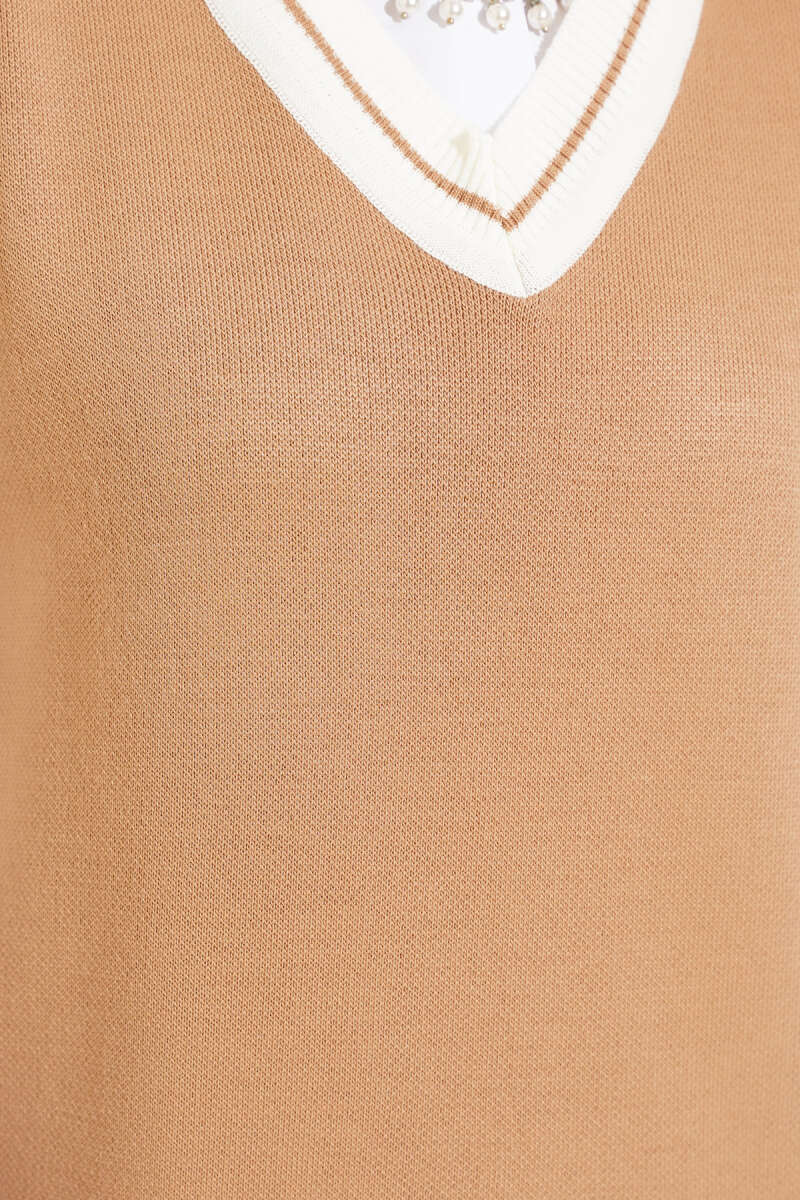 V Yaka Kısa Triko Süveter Büsküvi