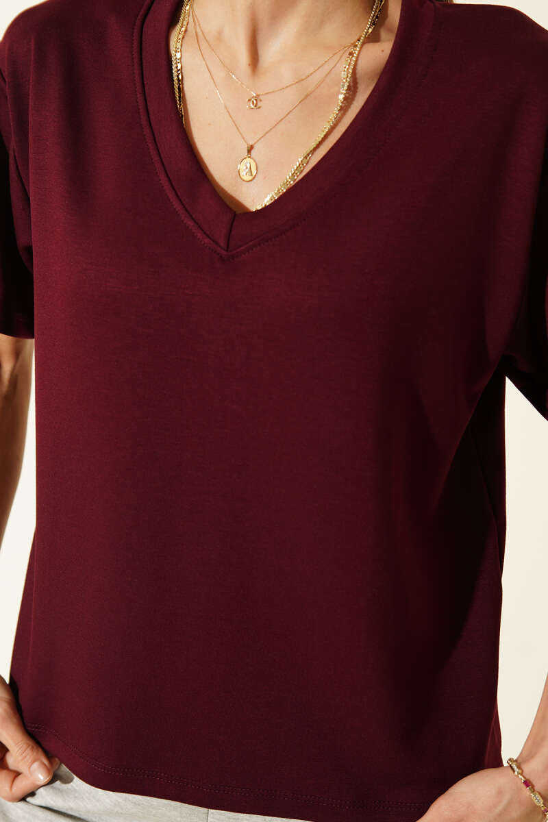 Görseldeki V Yaka Loyşa T-shirt, dökümlü kesimi ve yumuşak dokusuyla günlük stilinize konforlu bir şıklık katıyor. Kadın tshirt kategorisinin bu vazgeçilmez temel parçası; beyaz, kahve, mürdüm ve siyah renk seçenekleriyle her türlü alt giyimle zahmetsizce uyum sağlıyor. Zarif V yaka detayı ve rahat formu sayesinde gün boyu kendinizi özgür hissedeceğiniz bu tasarım, gardırobunuzun en joker parçalarından biri olacak.