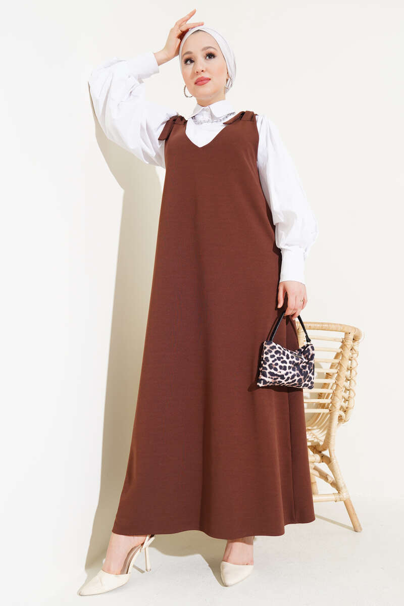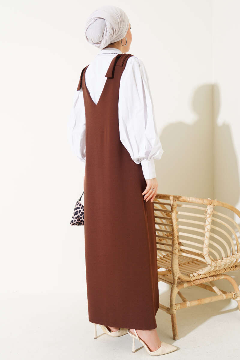 Yatay Çizgili İp Bağcıklı Triko Elbise Kahve