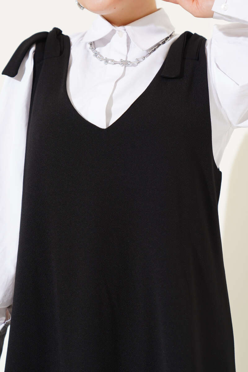 Yatay Çizgili İp Bağcıklı Triko Elbise Siyah