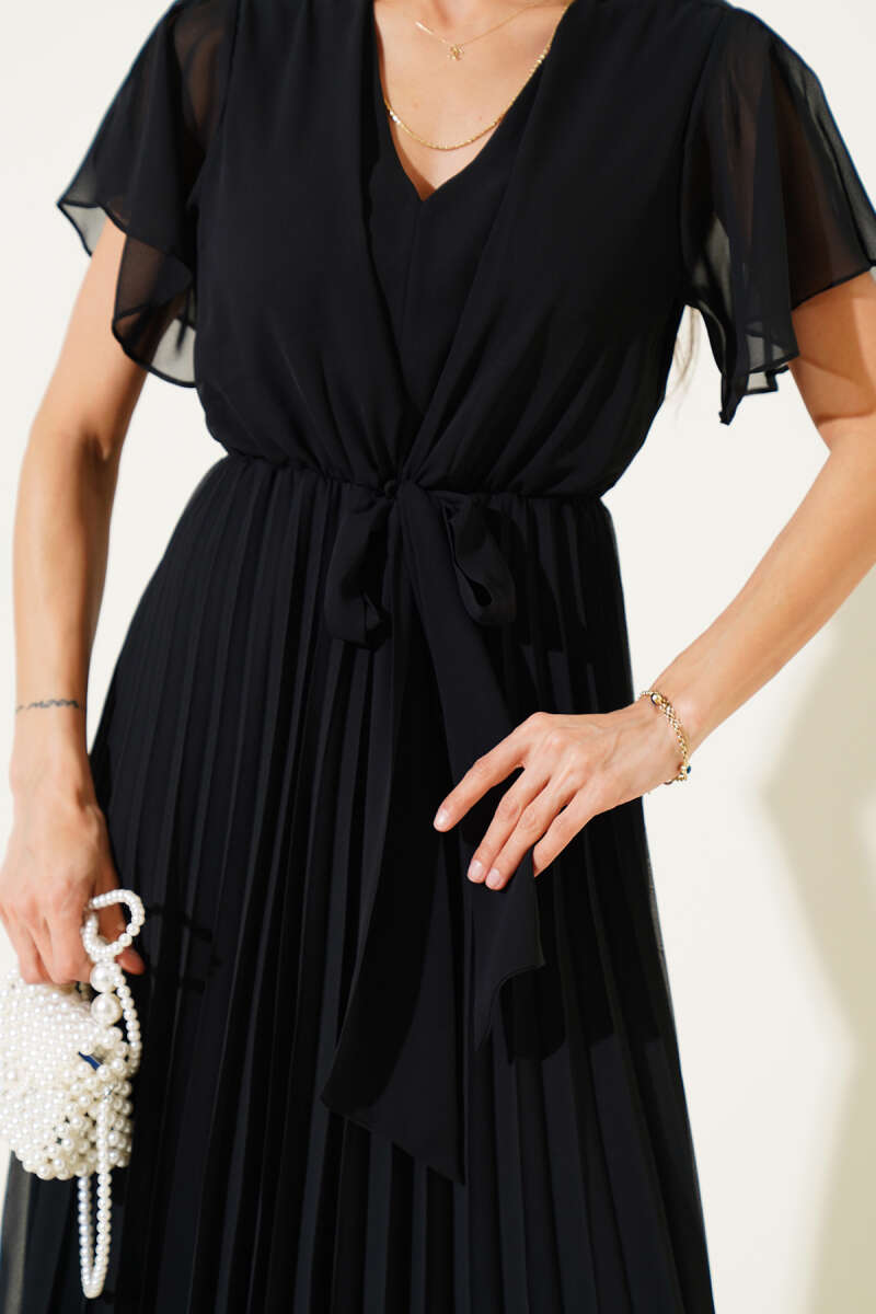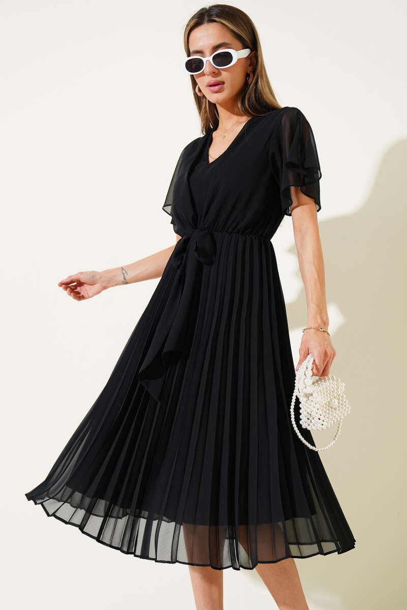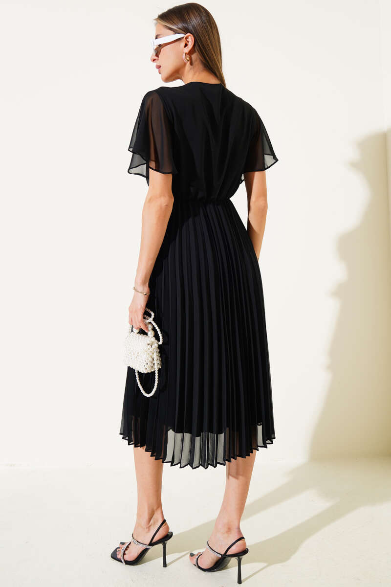 V Yaka Pileli Şifon Midi Elbise Siyah