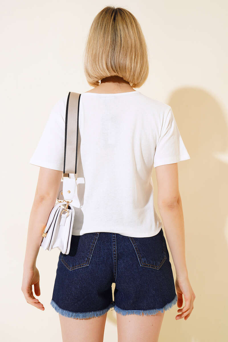V Yaka Renkli Düğmeli Bluz Ekru
