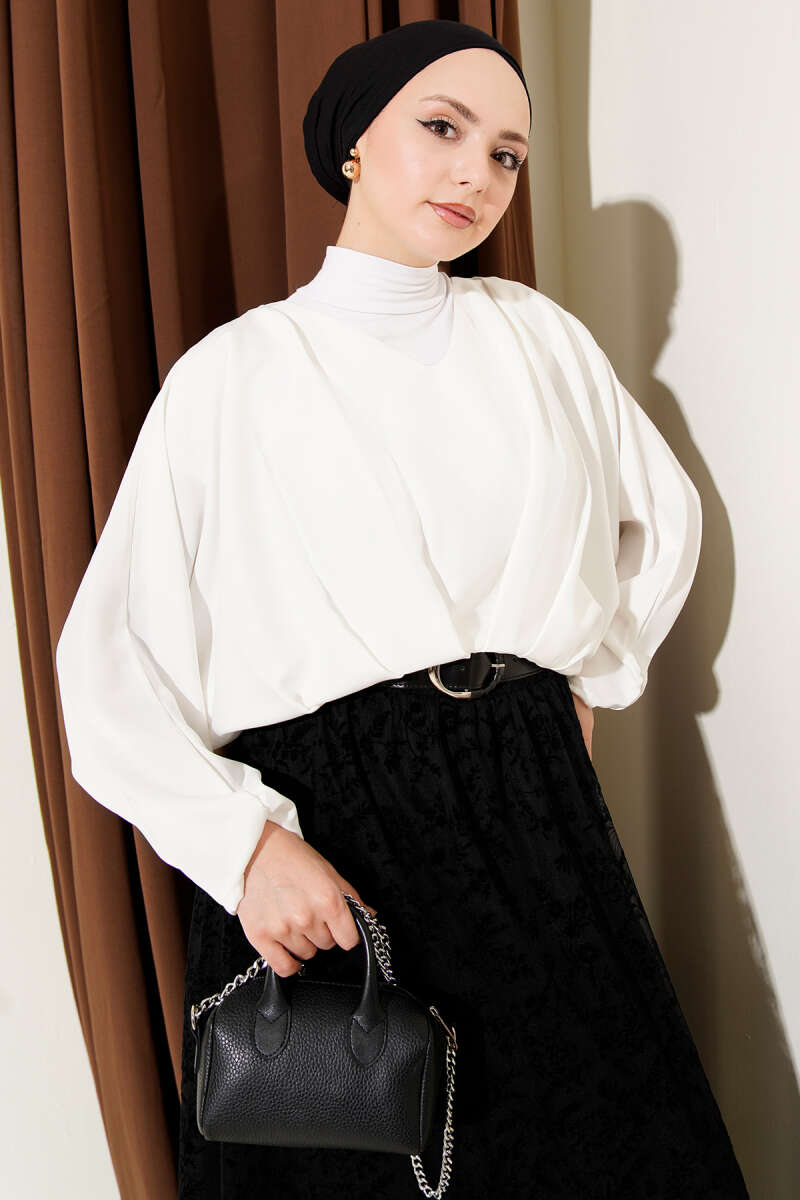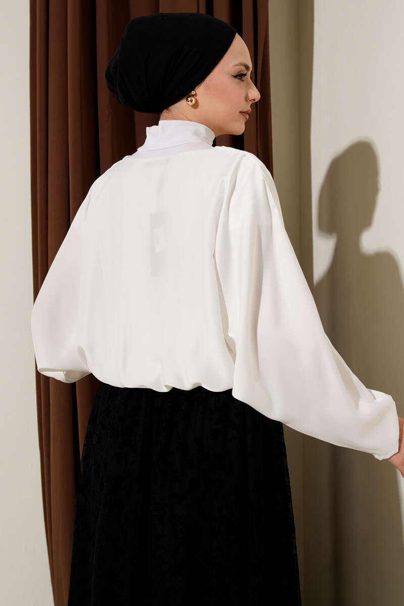 V Yaka Yarasa Kol Saten Bluz Ekru