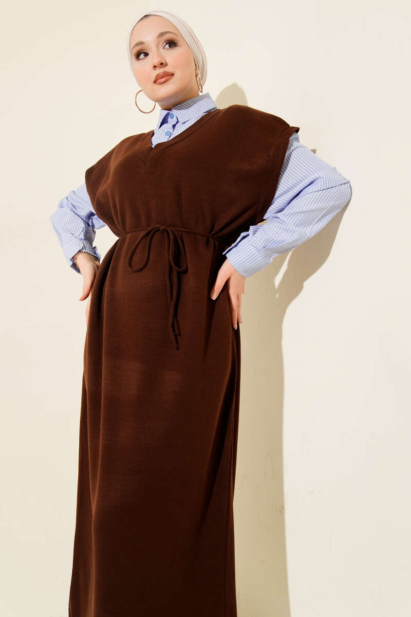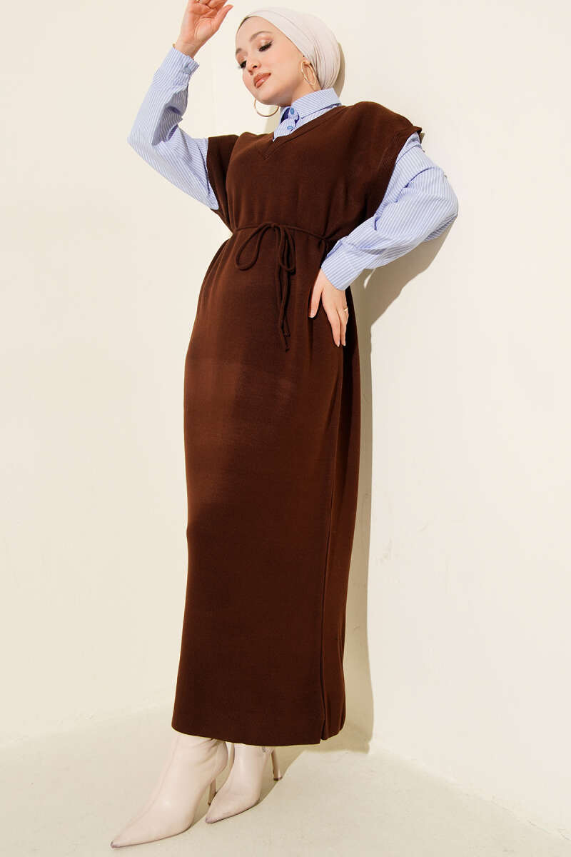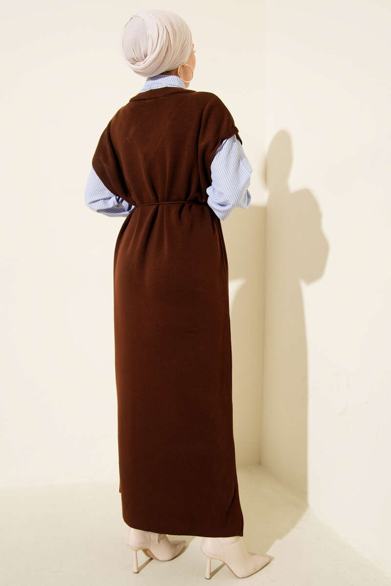 Çizgi Gömlek Garnili Triko Elbise Kahve