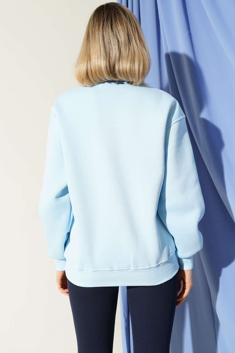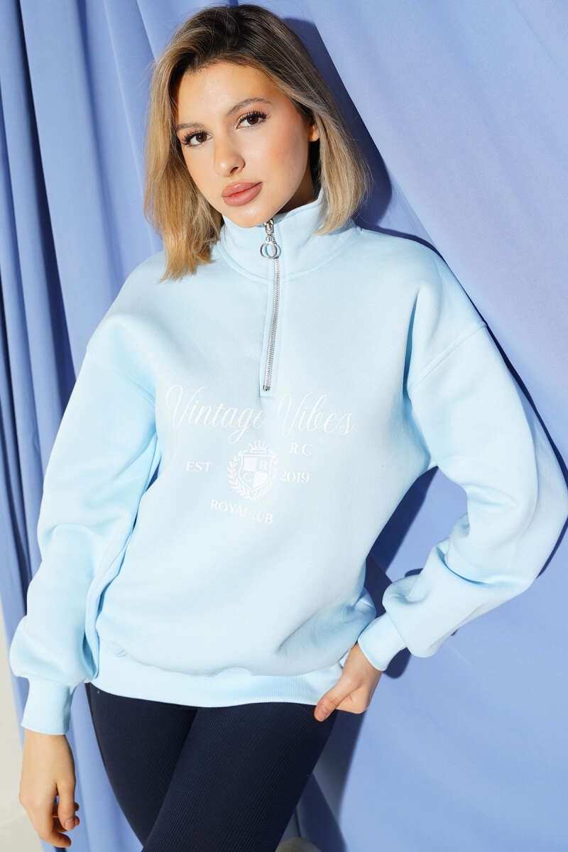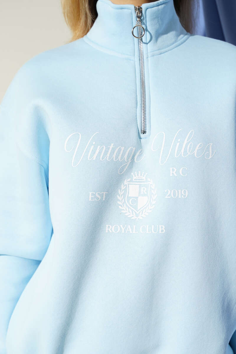 Vintage Baskılı Fermuarlı Üç İplik Sweatshirt Çağla Yeşili