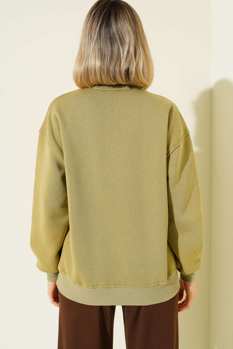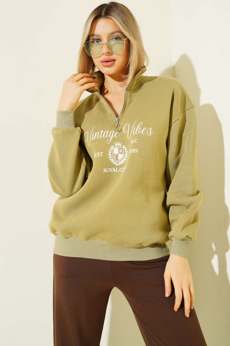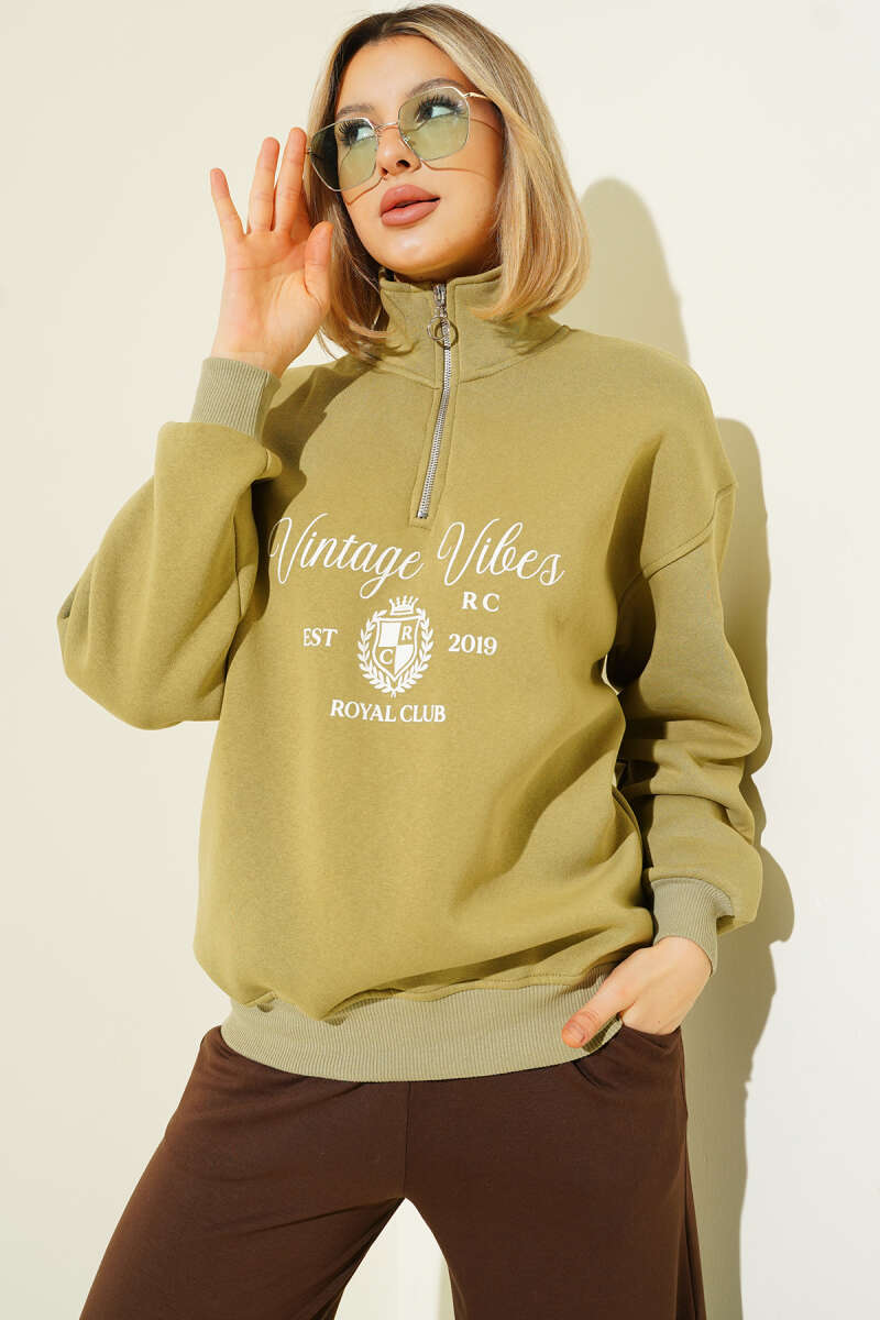 Vintage Baskılı Fermuarlı Üç İplik Sweatshirt Ekru