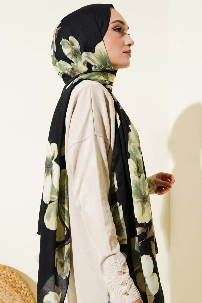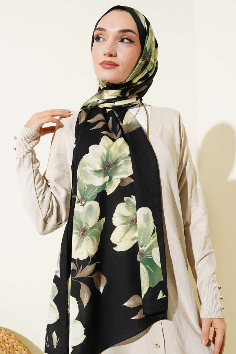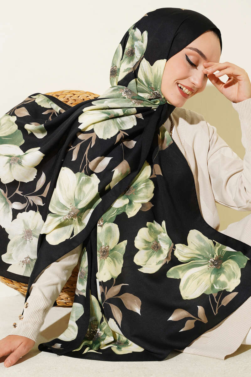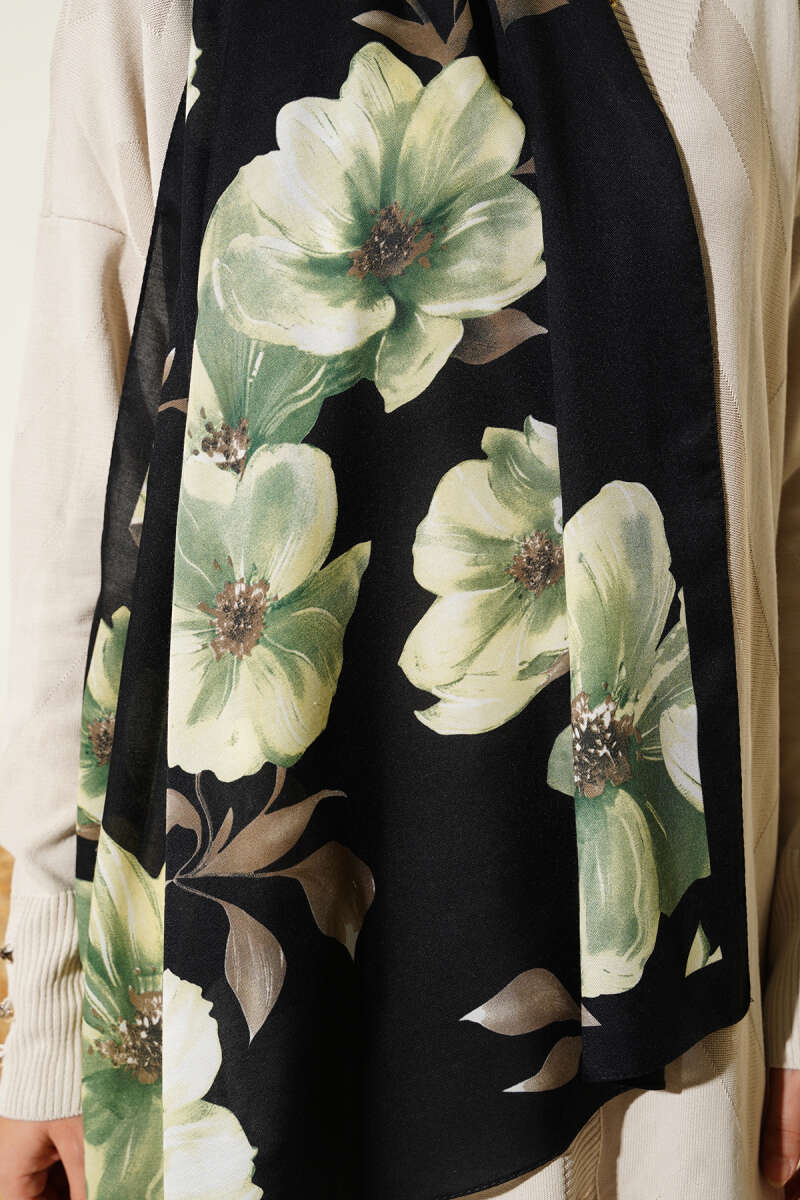 Çiçekli Şerit Geçiş Detaylı Şal Zümrüt