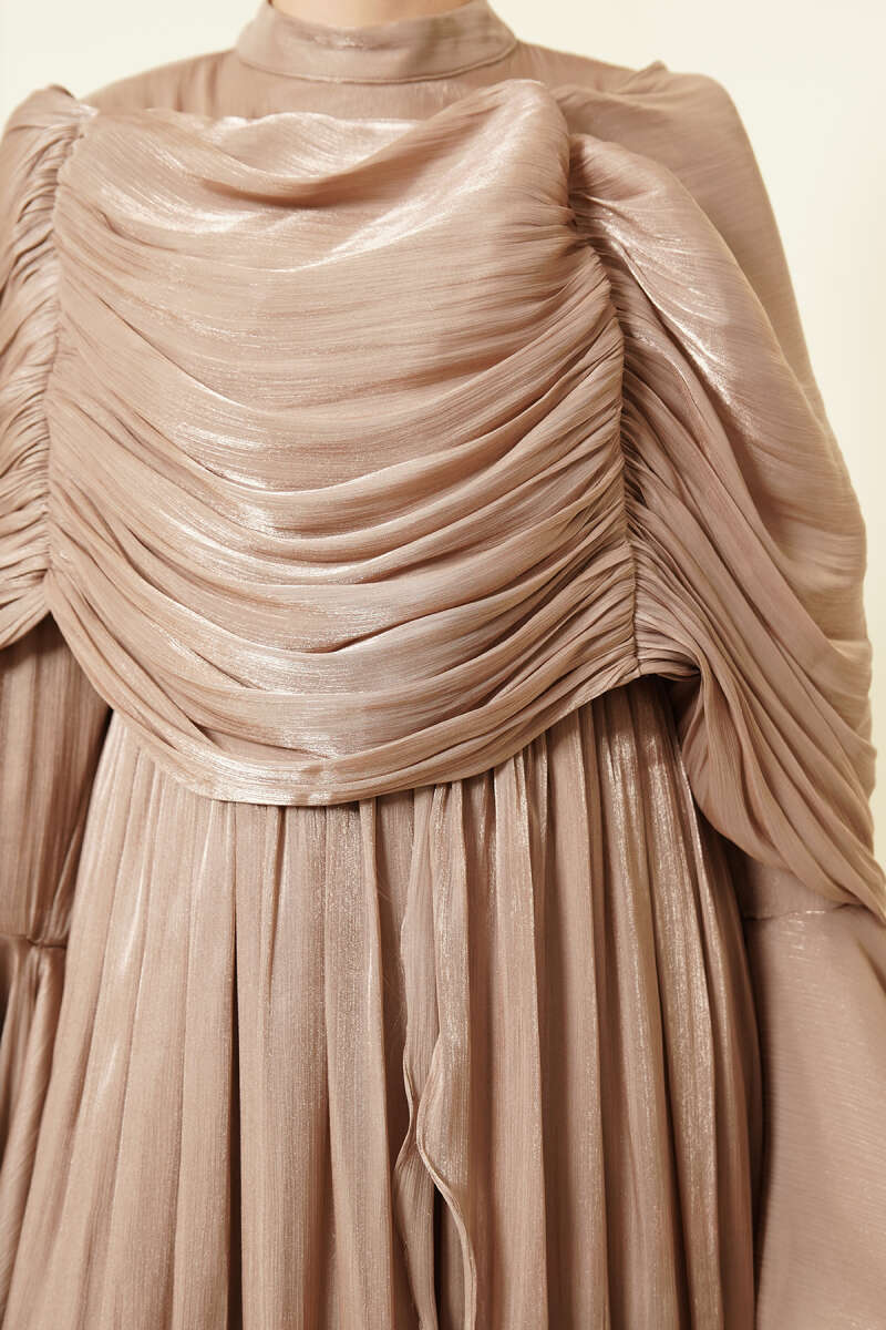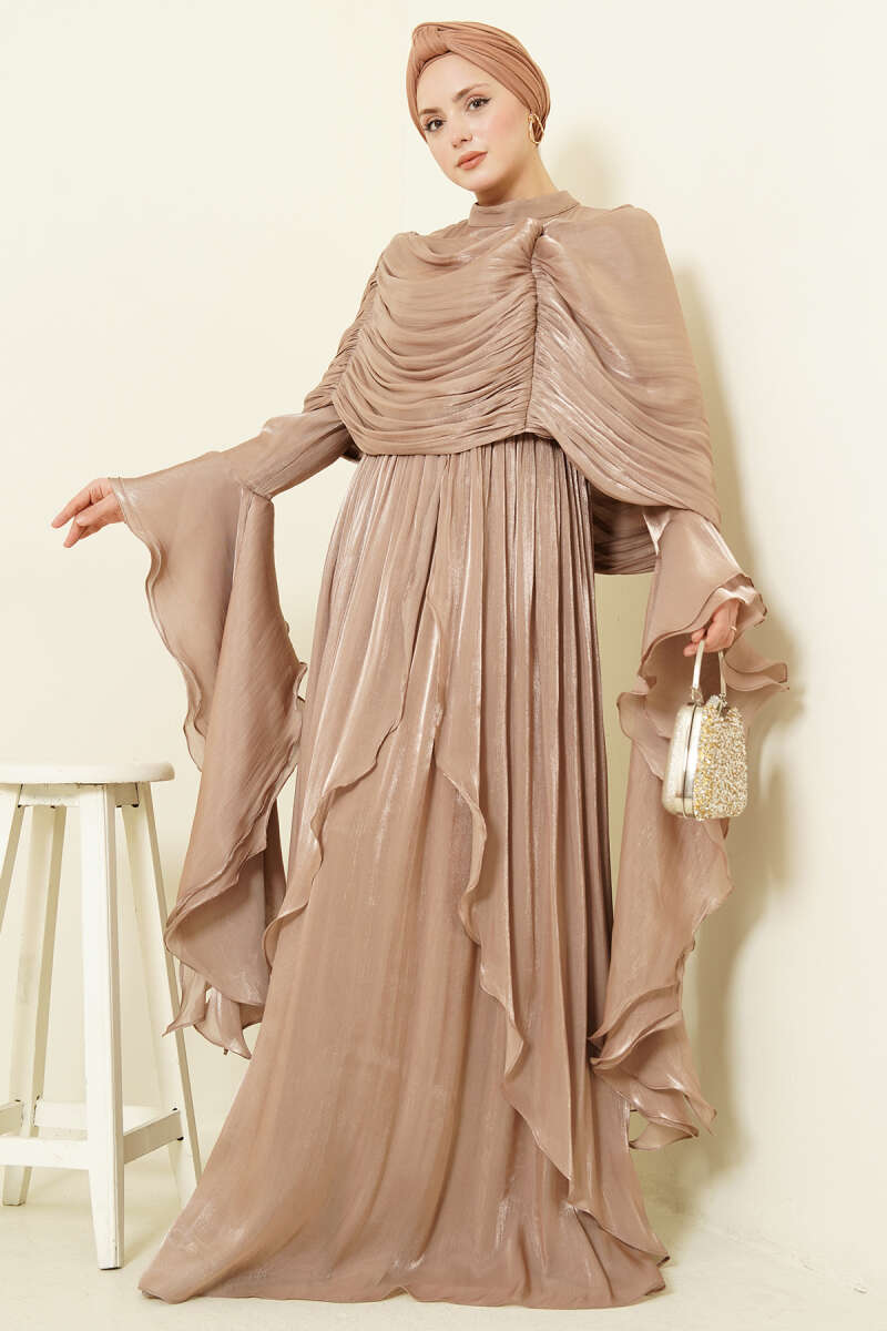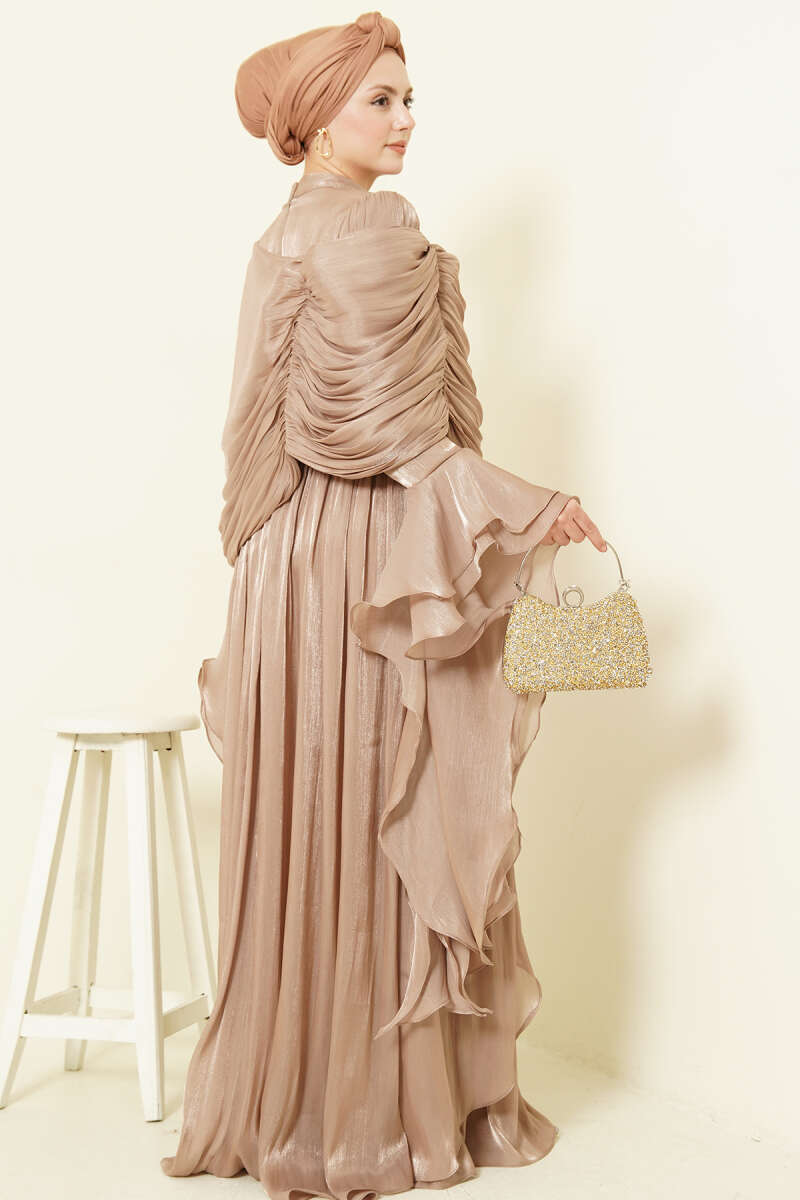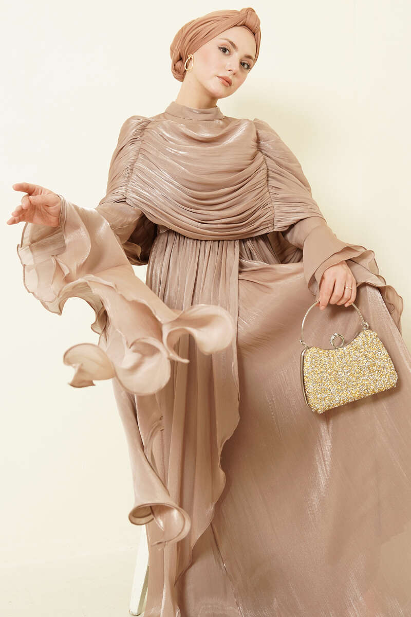 Volan Detaylı Drapeli Fırfırlı Abiye Elbise Bej