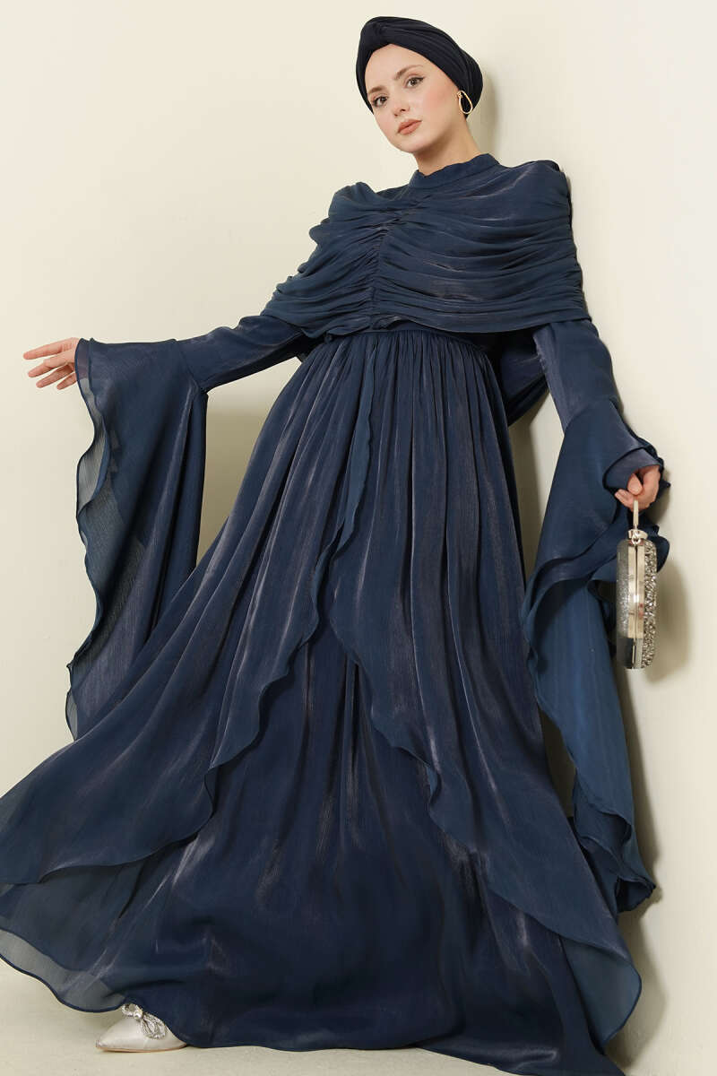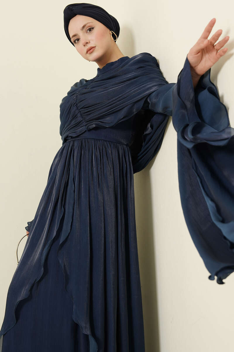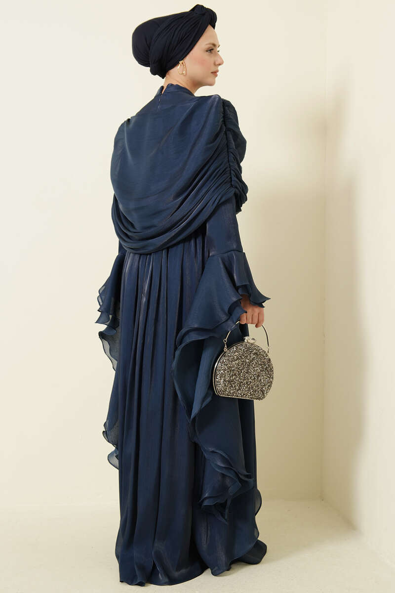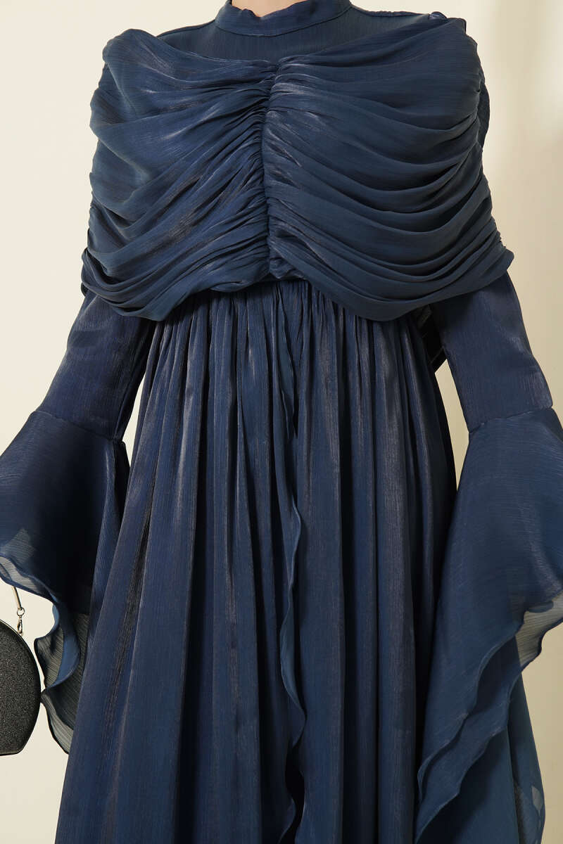 Volan Detaylı Drapeli Fırfırlı Abiye Elbise Lacivert
