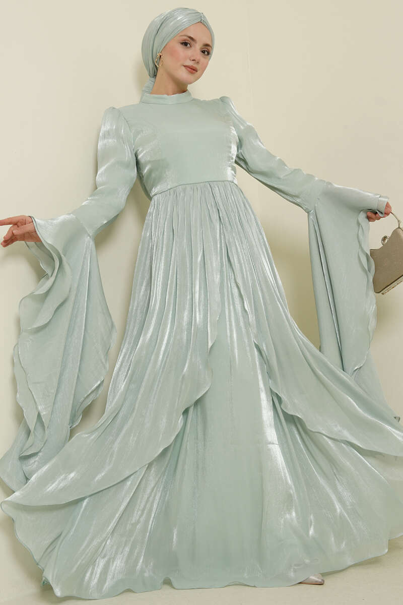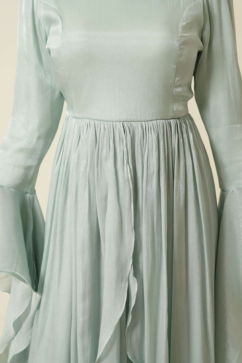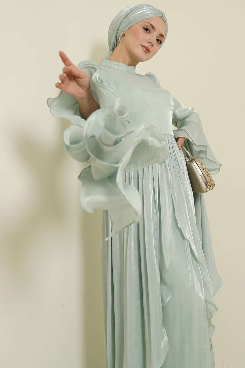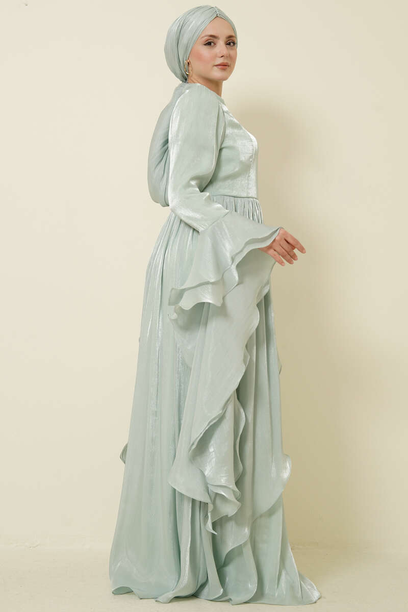 Volan Detaylı Drapeli Fırfırlı Abiye Elbise Mint