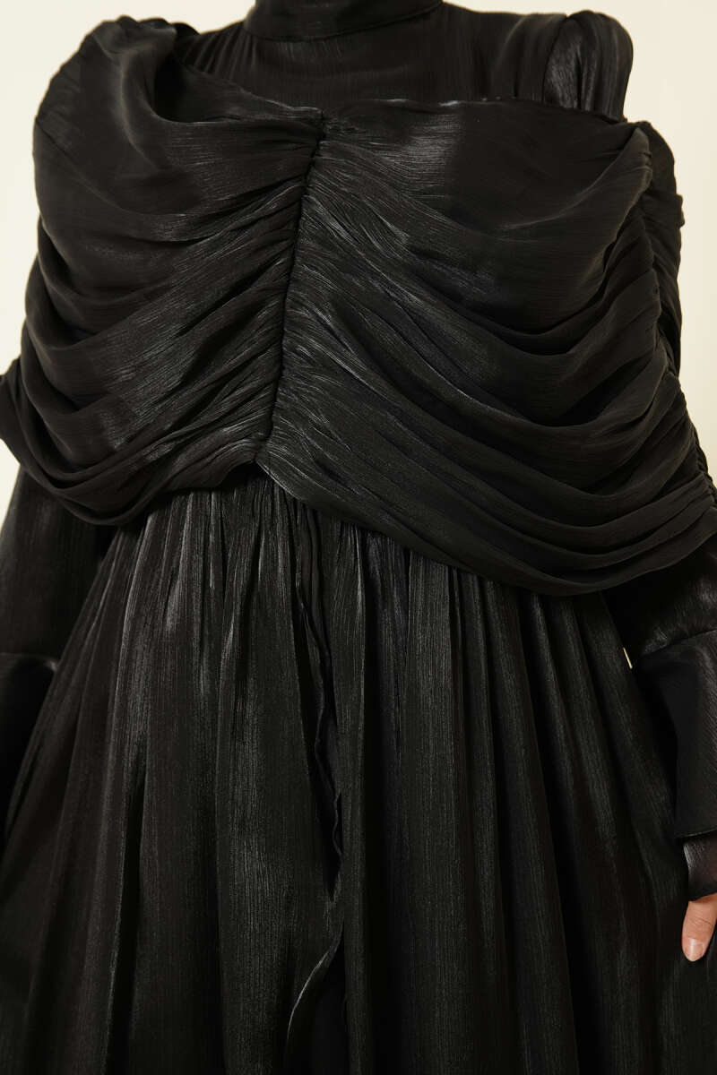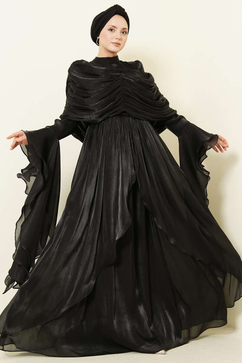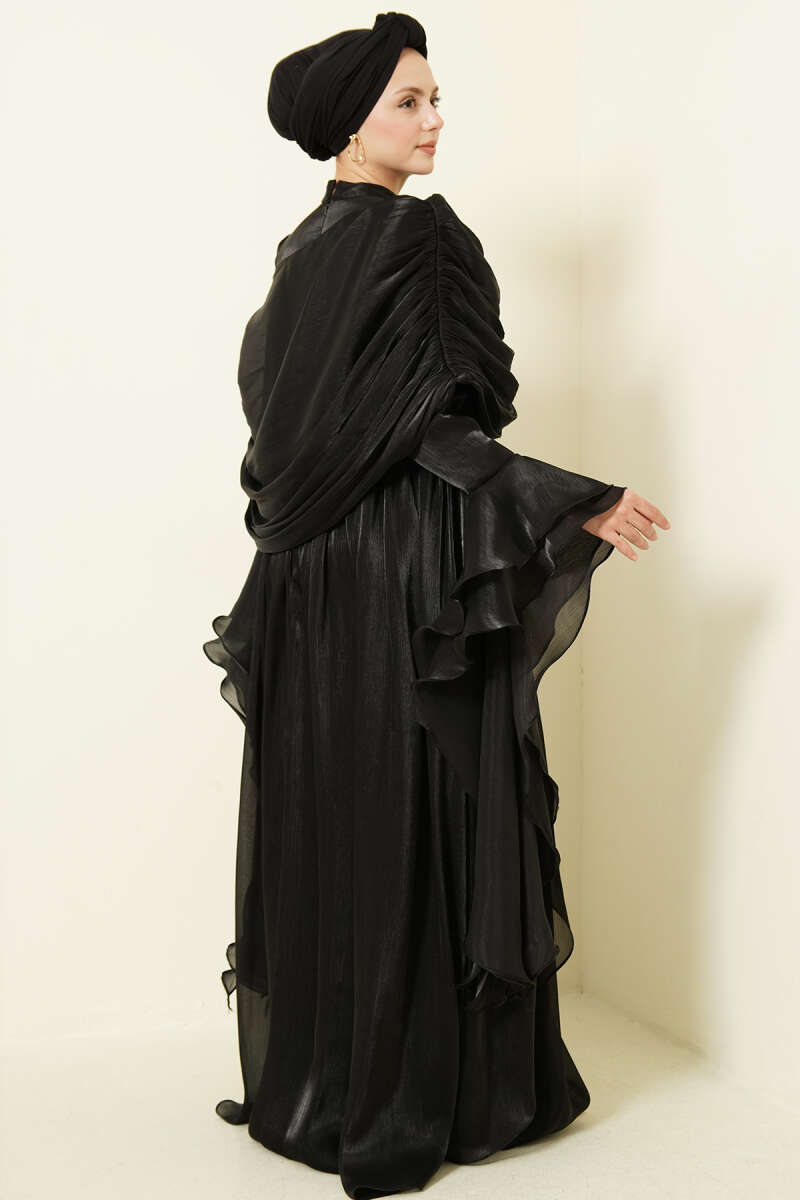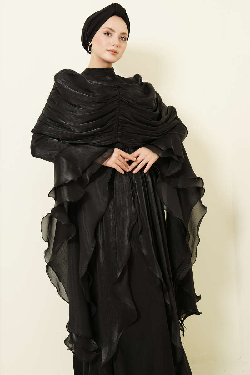Volan Detaylı Drapeli Fırfırlı Abiye Elbise Siyah