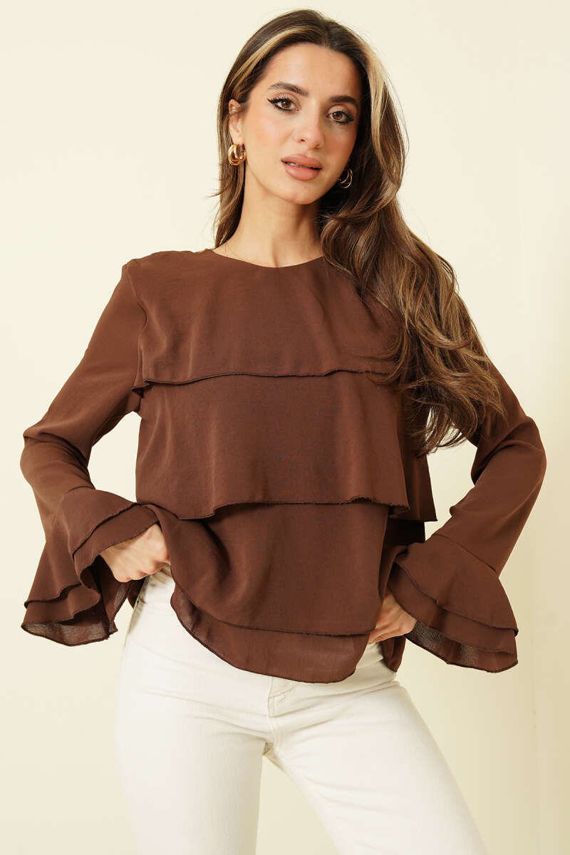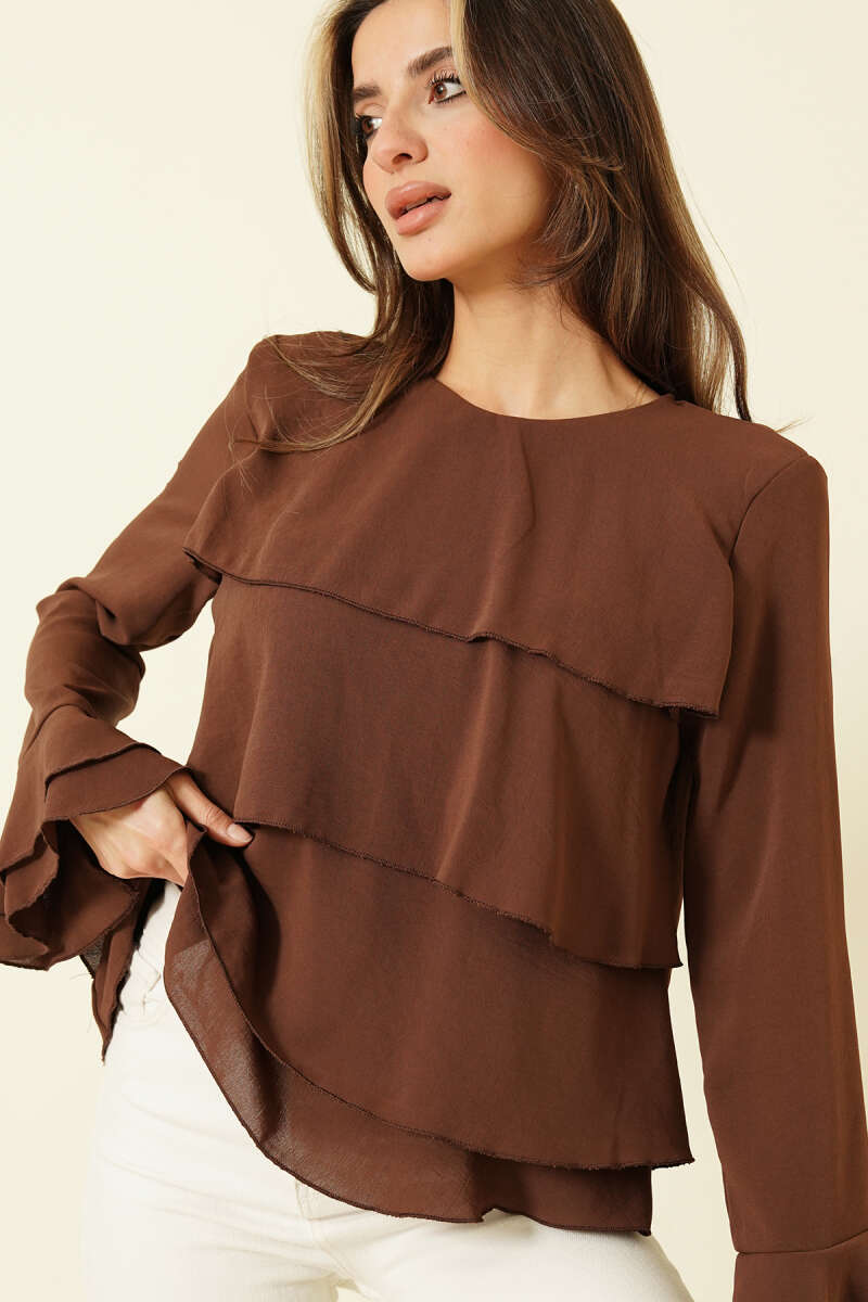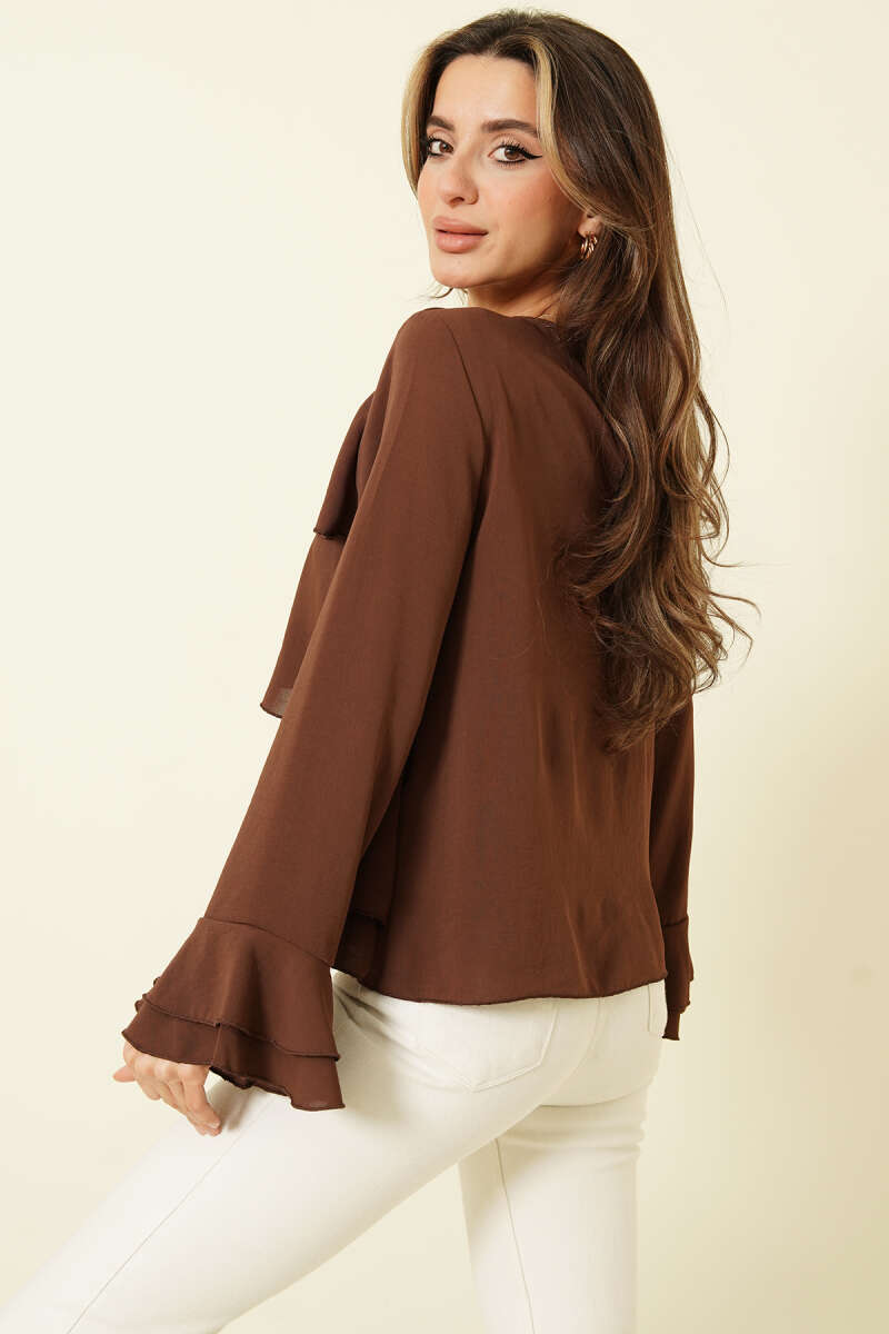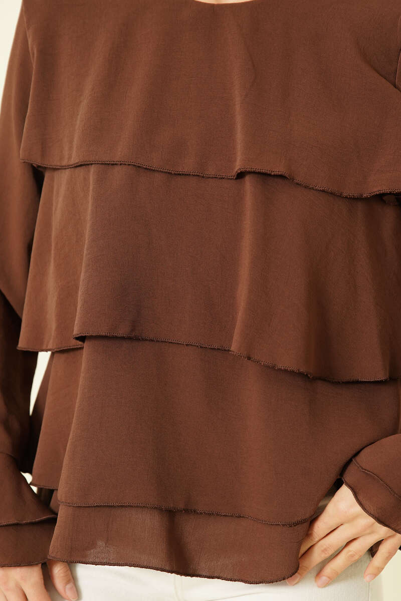 V Yaka Uzun Kol Tensel Bluz Kahve