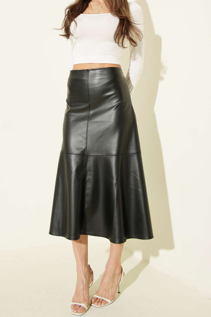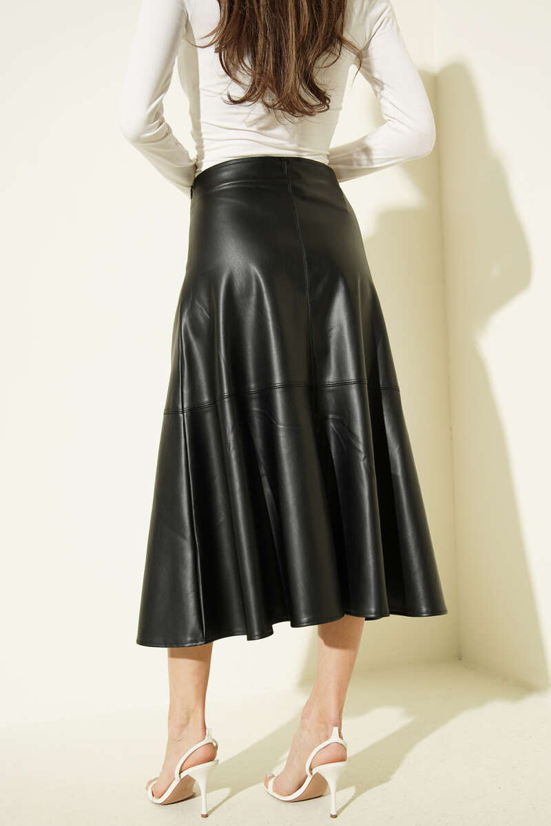 Volanlı Bel Fermuarlı Deri Midi Etek Siyah