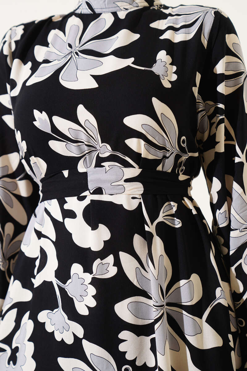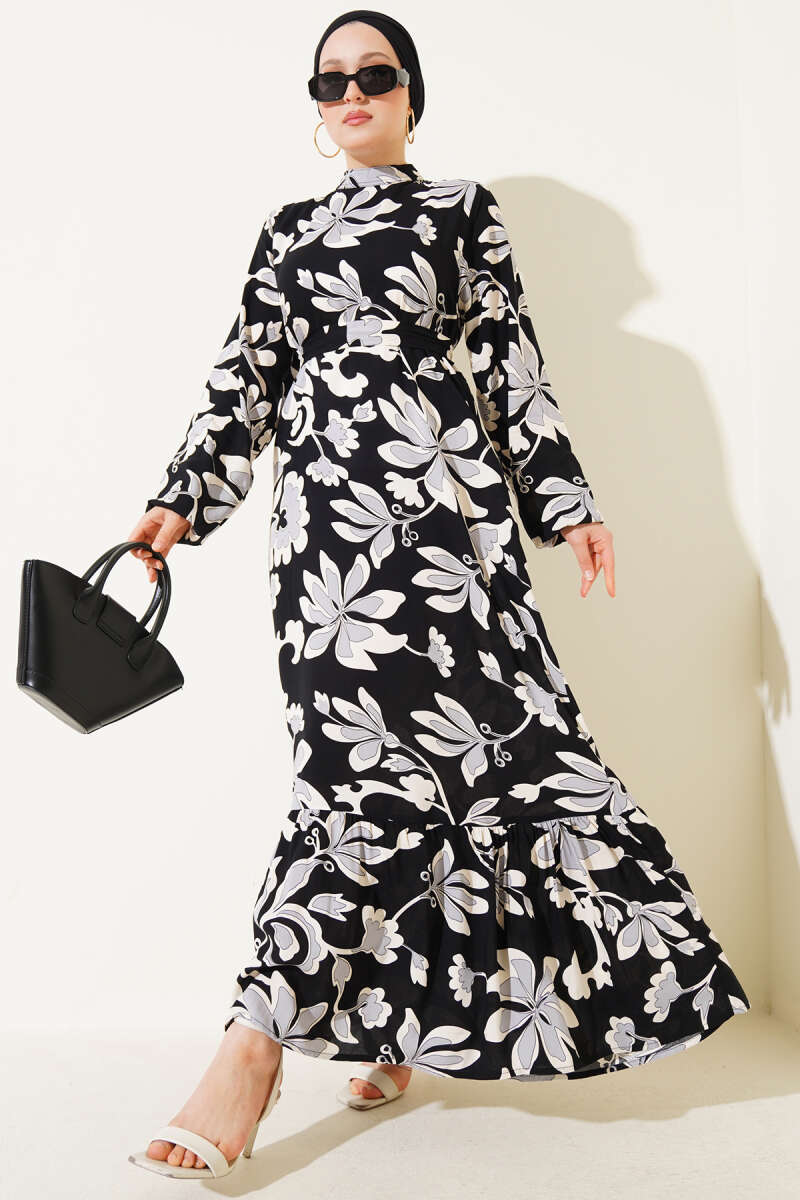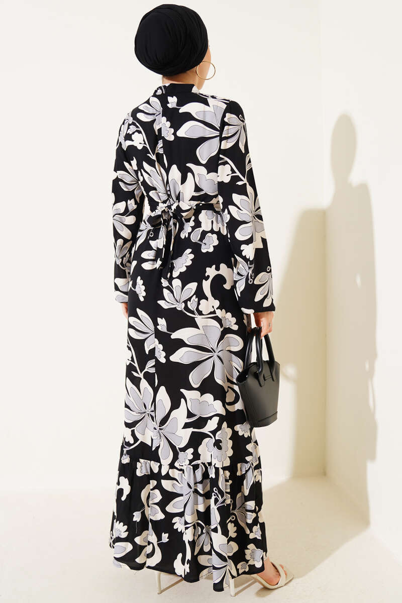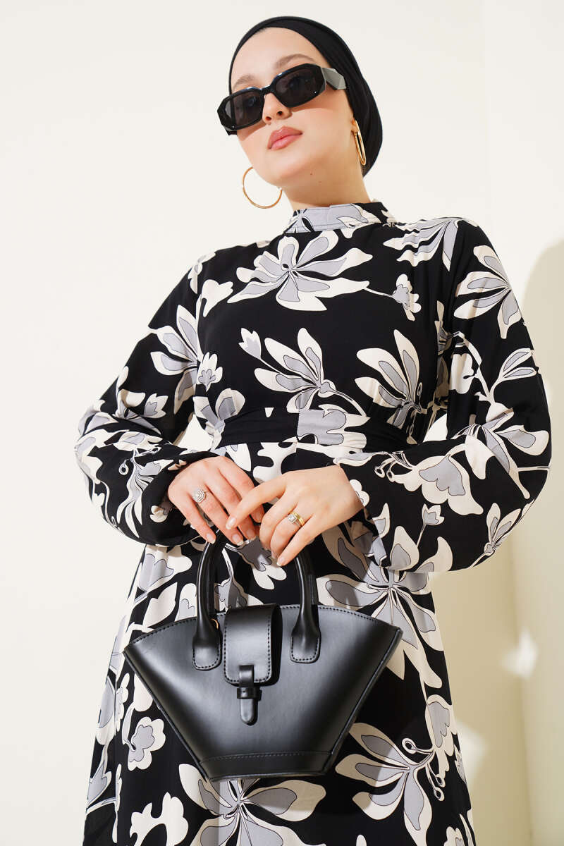 Önü Düğmeli Ekose Desen Elbise Siyah
