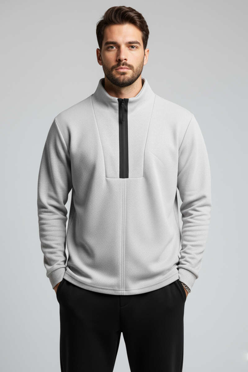 Waffle Fermuarlı Erkek Sweatshirt Ekru