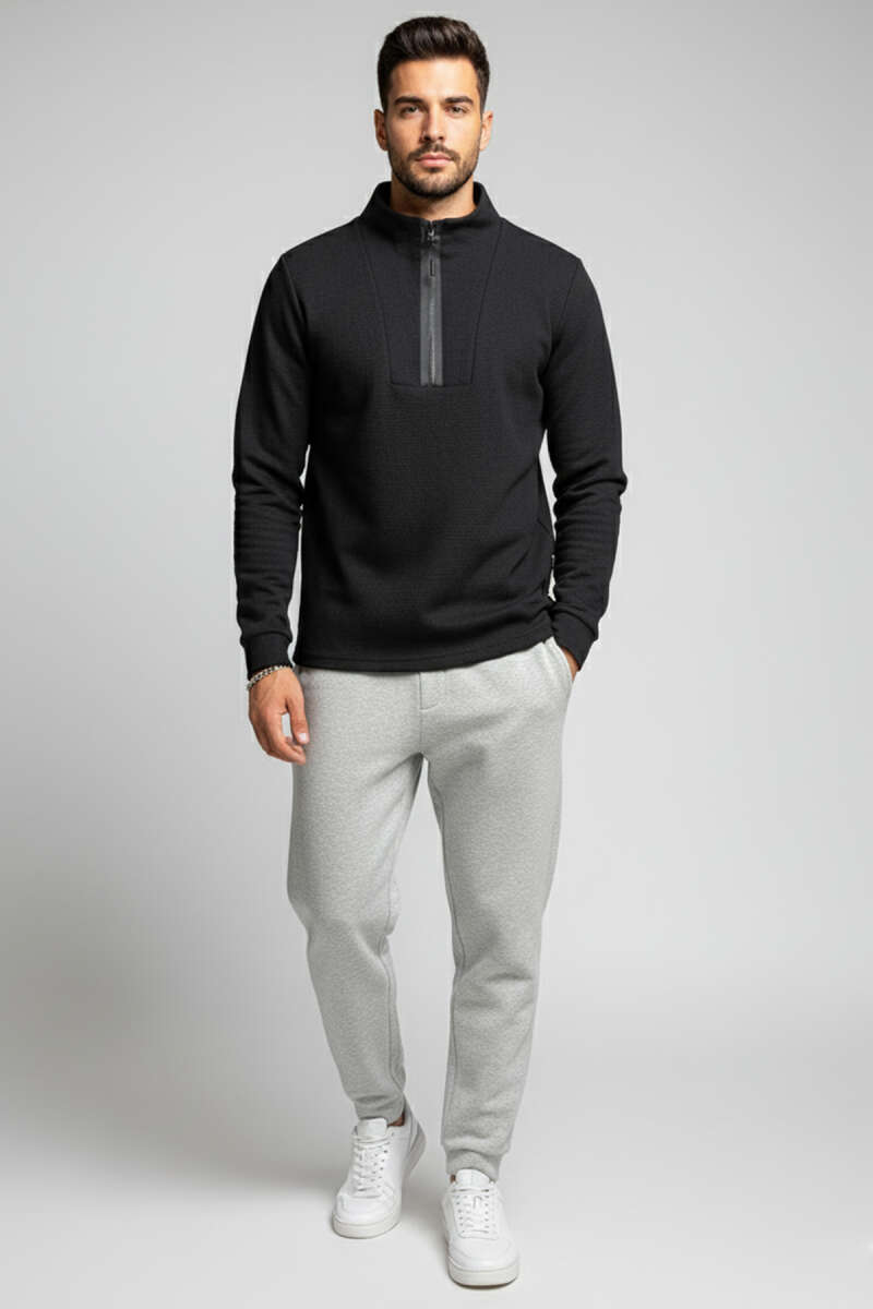 Waffle Fermuarlı Erkek Sweatshirt Gri
