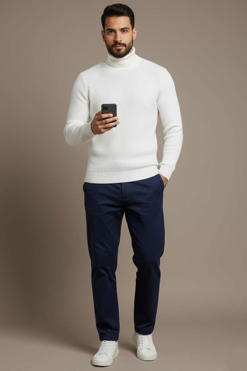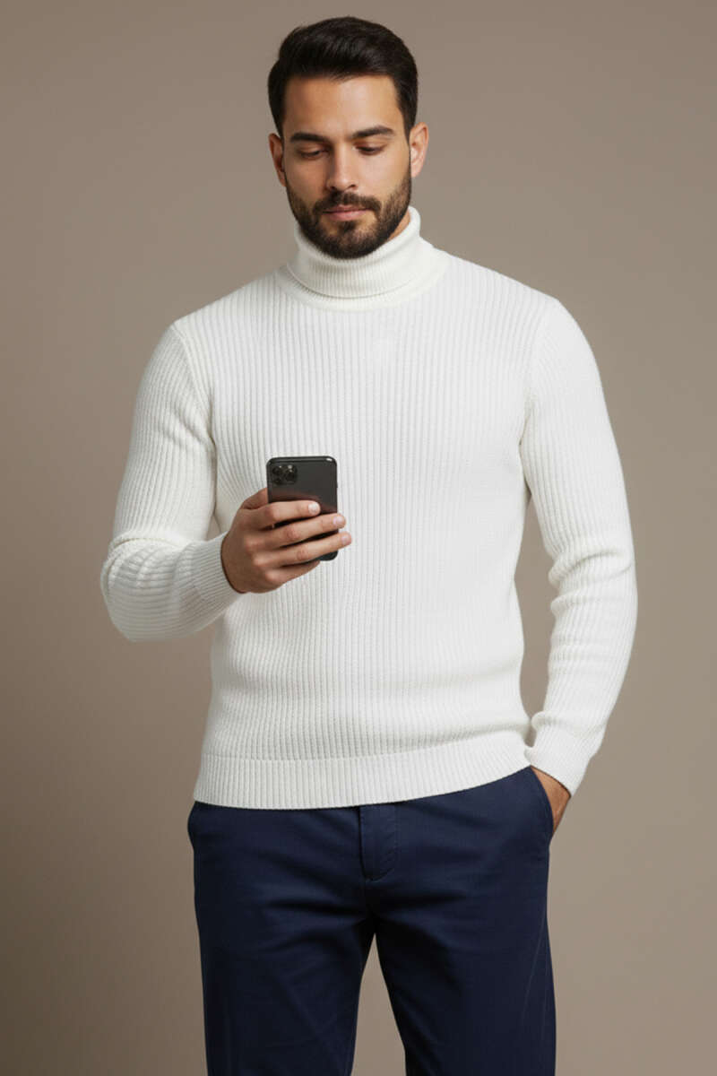 Pirinç Örgü Balıkçı Yaka Erkek Kazak Ekru
