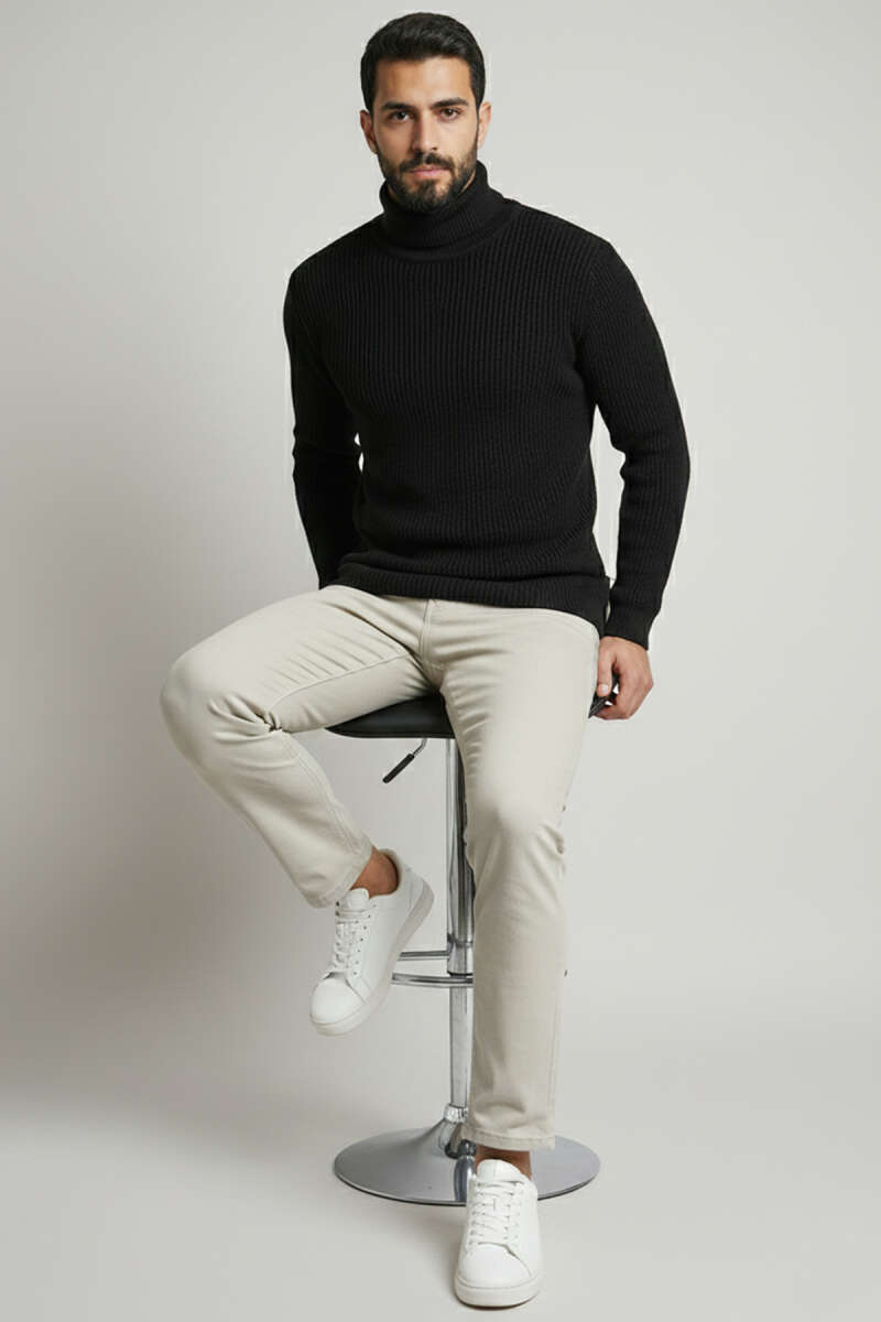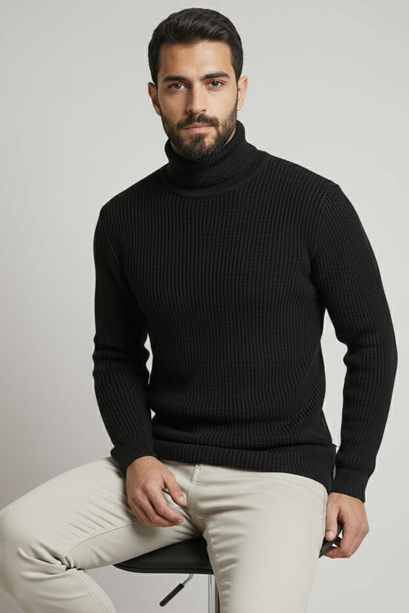 Pirinç Örgü Balıkçı Yaka Erkek Kazak Siyah
