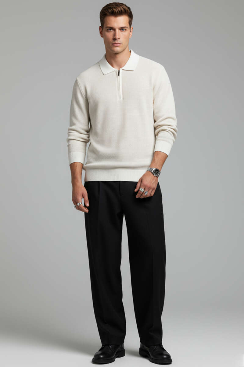 Waffle Kumaş Polo Yaka Fermuarlı Erkek Sweatshirt Siyah