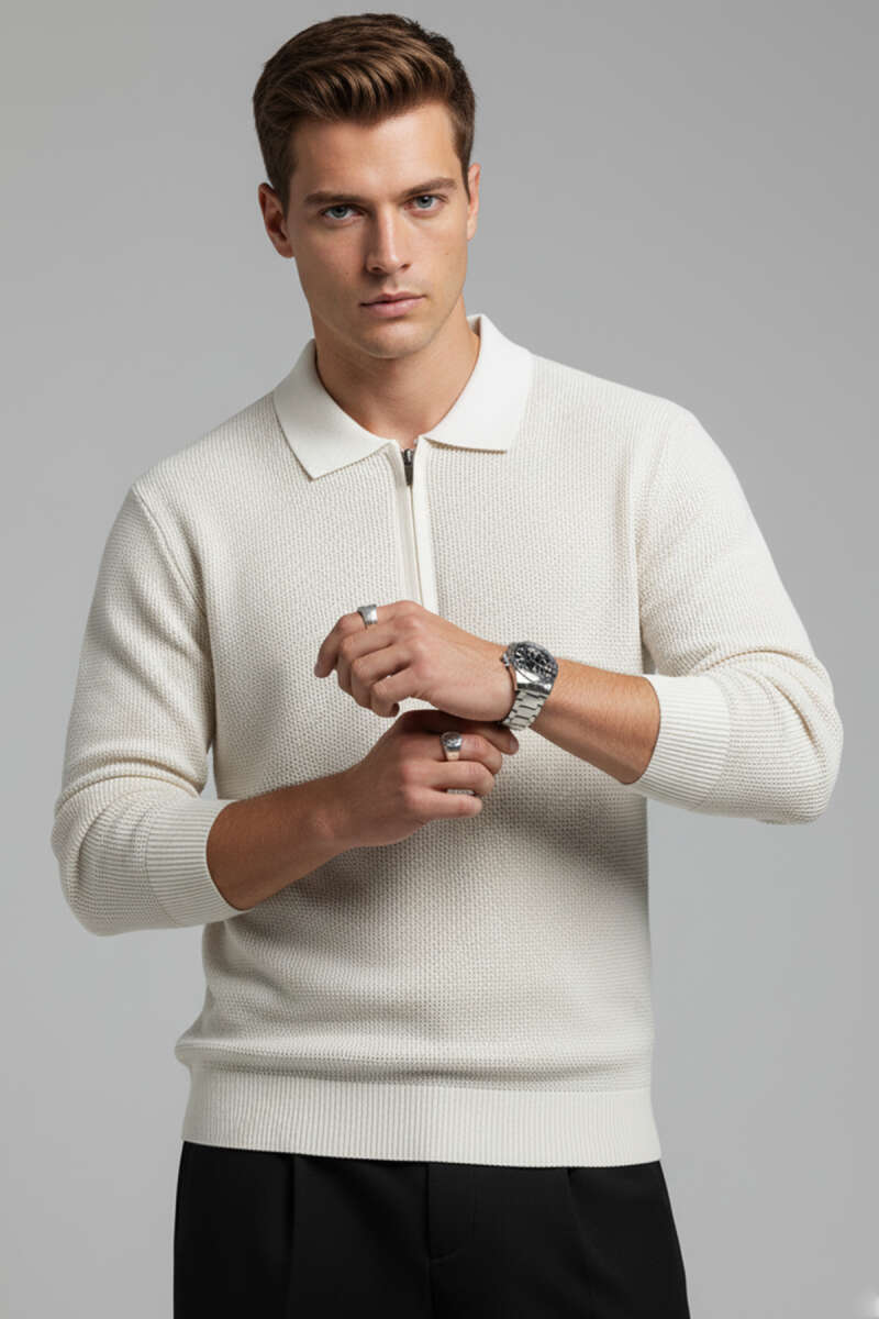 Dik Yaka Yarım Fermuar Sweatshirt Ekru