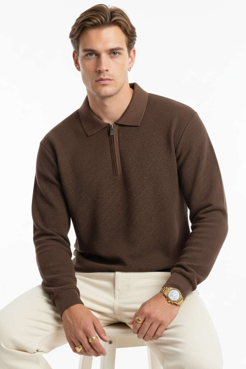 Dik Yaka Yarım Fermuar Sweatshirt Kahve