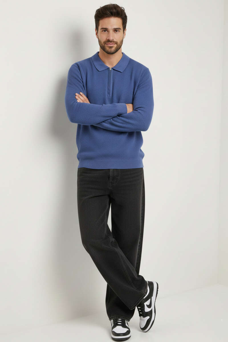 Waffle Kumaş Polo Yaka Fermuarlı Erkek Sweatshirt İndigo