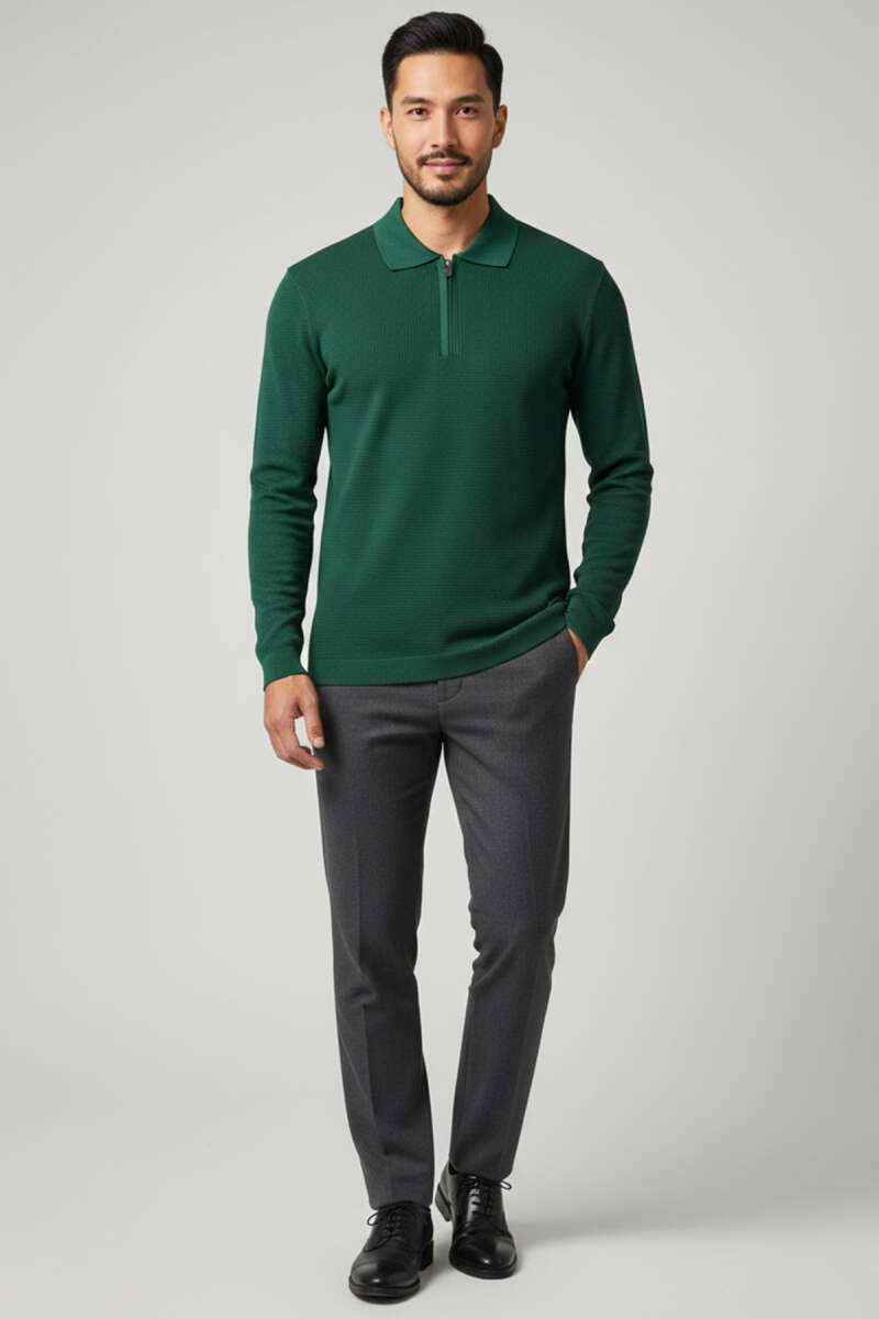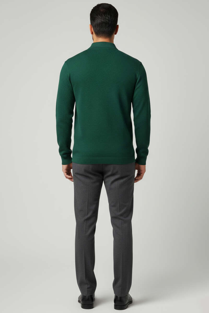 Waffle Kumaş Polo Yaka Fermuarlı Erkek Sweatshirt Bej