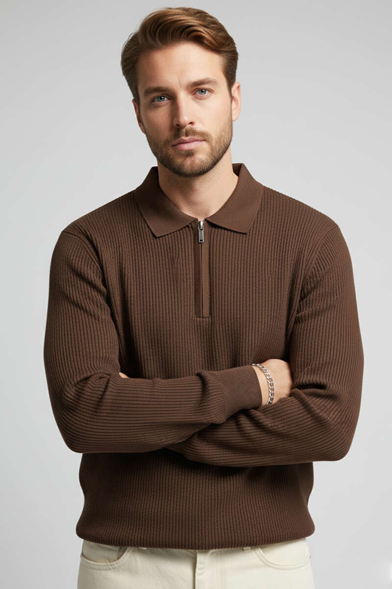 Polo Yaka Petek Örme Detaylı Triko Erkek Kazak Kahve