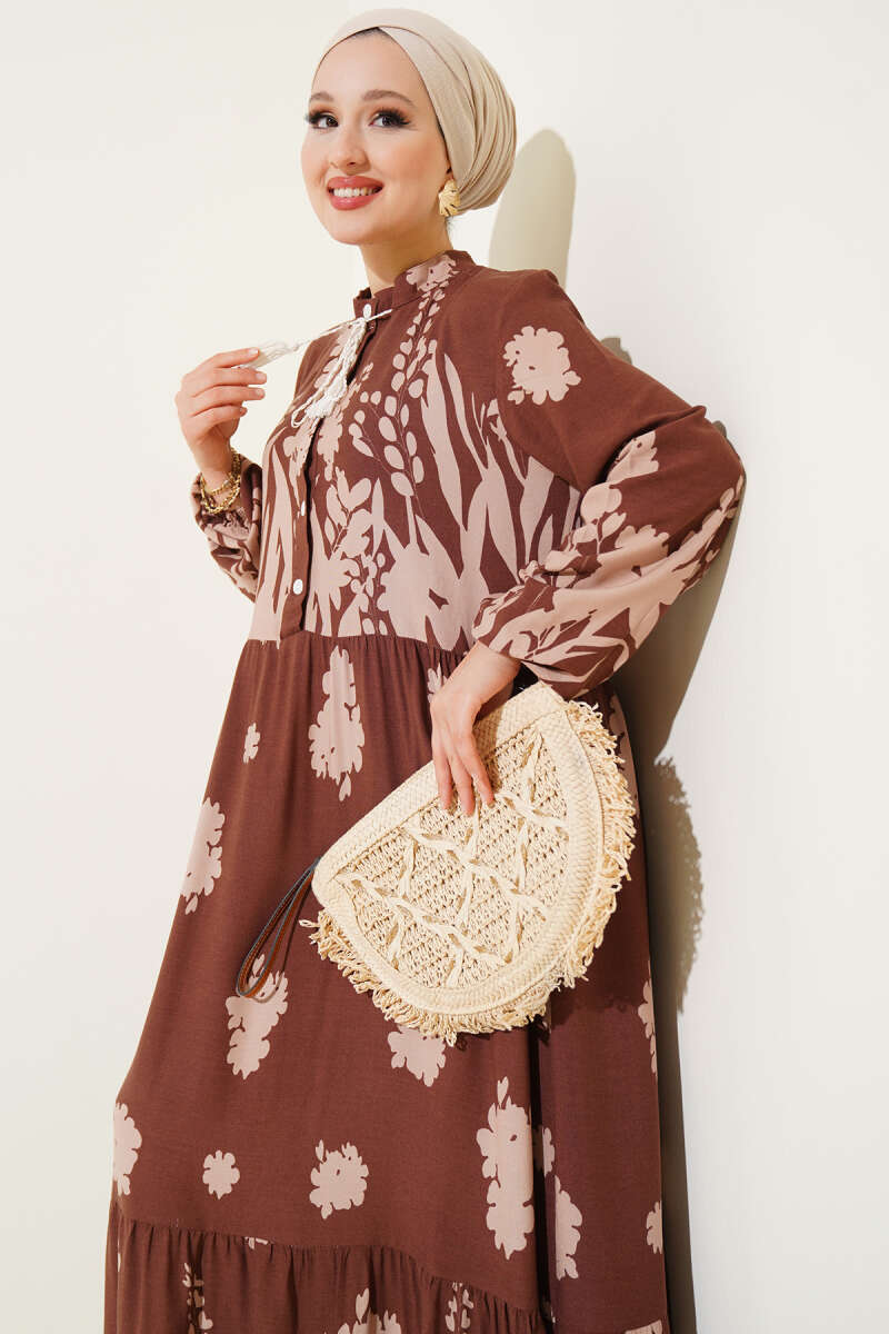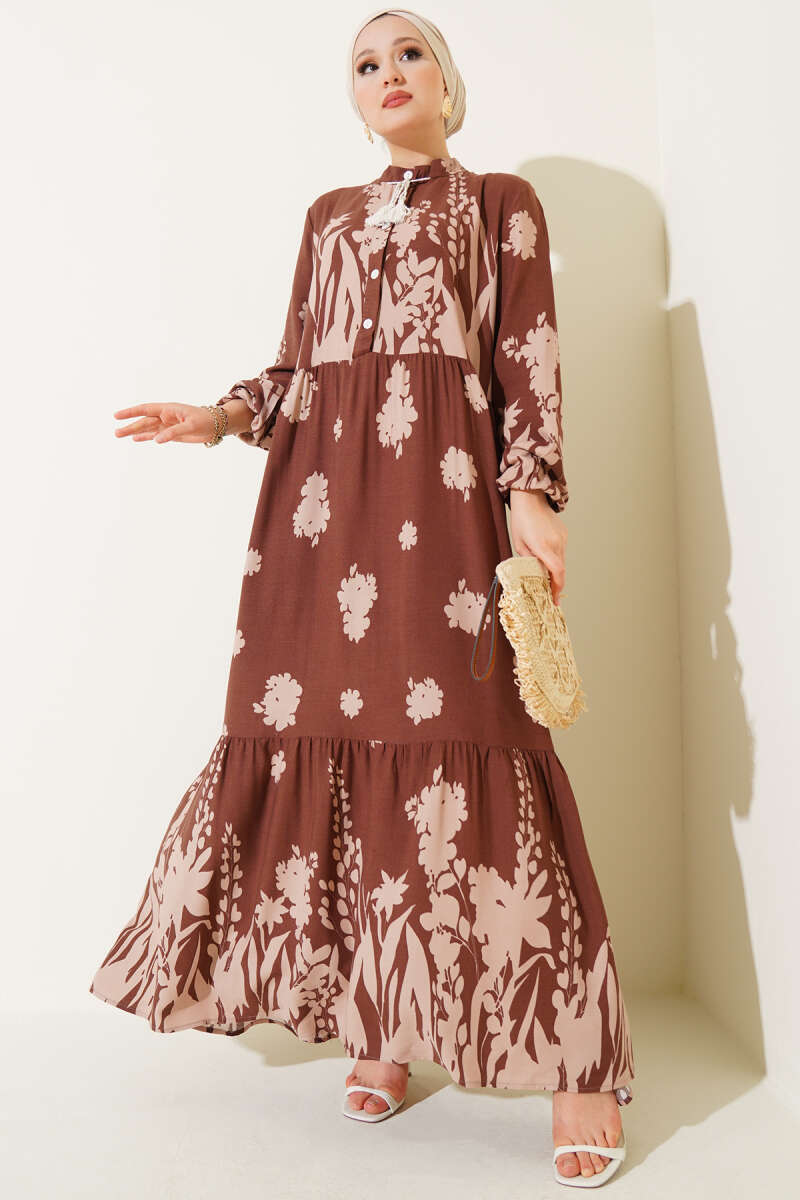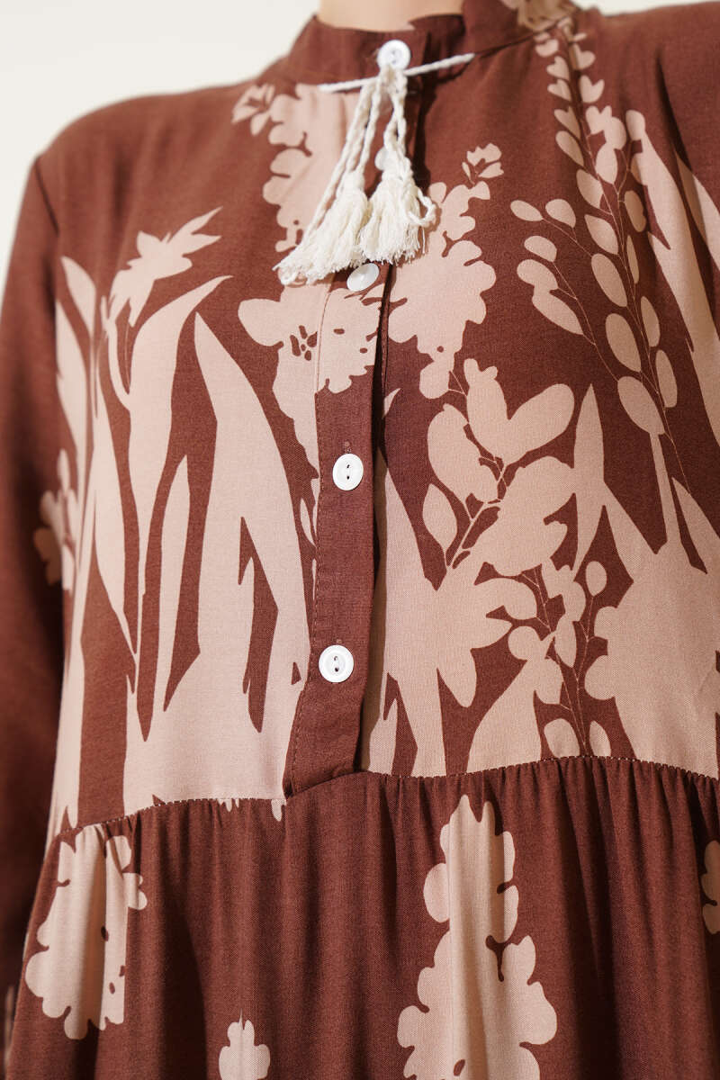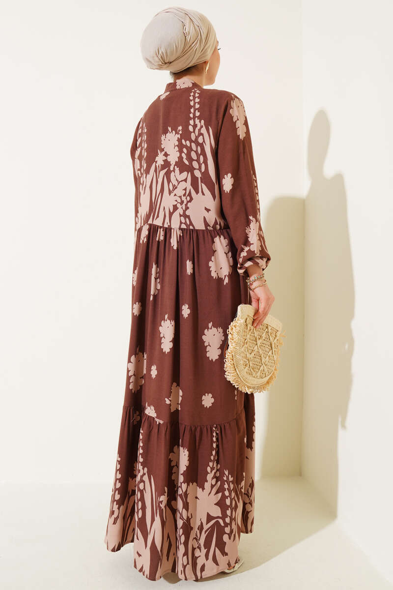 Düğmeli Tensel İnce Kemerli Elbise Kahve