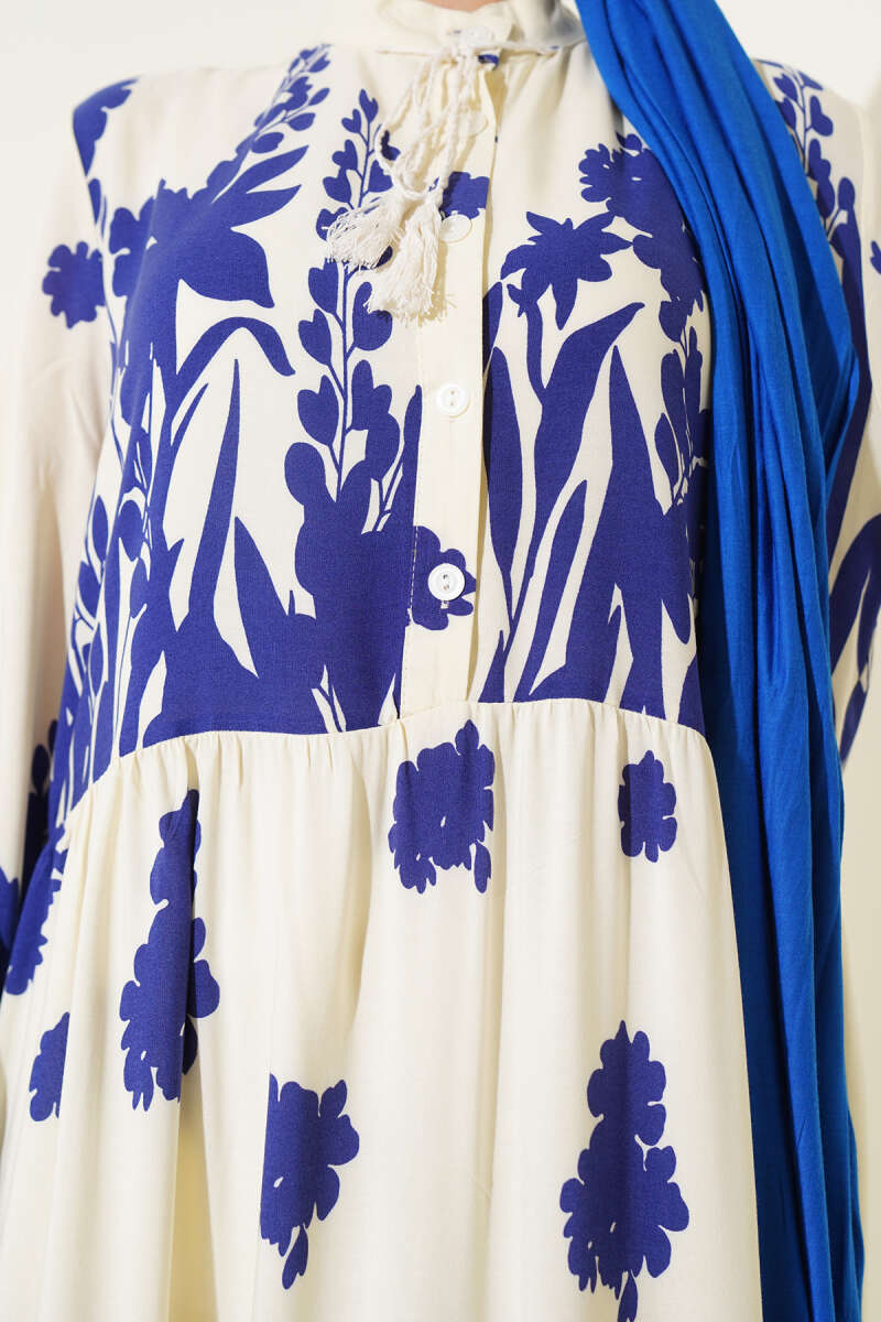 Yaka Bağcıklı Desenli Elbise Kahve