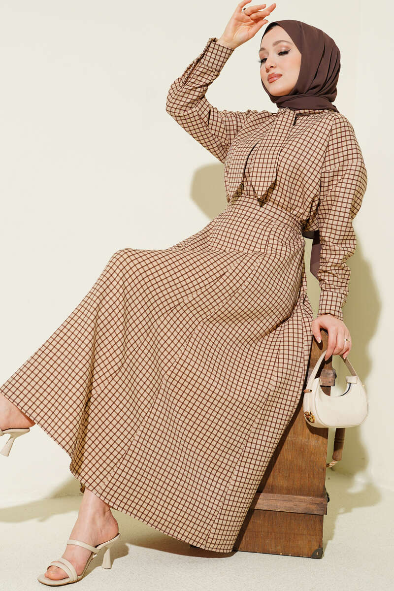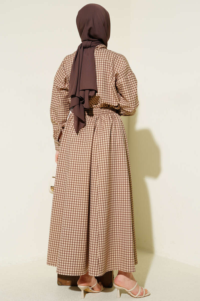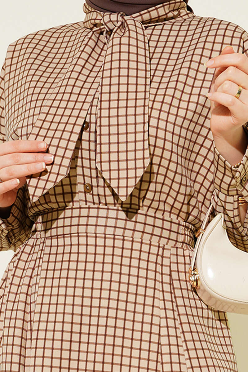 Yaka Bağlamalı Kareli Etekli Takım Bej