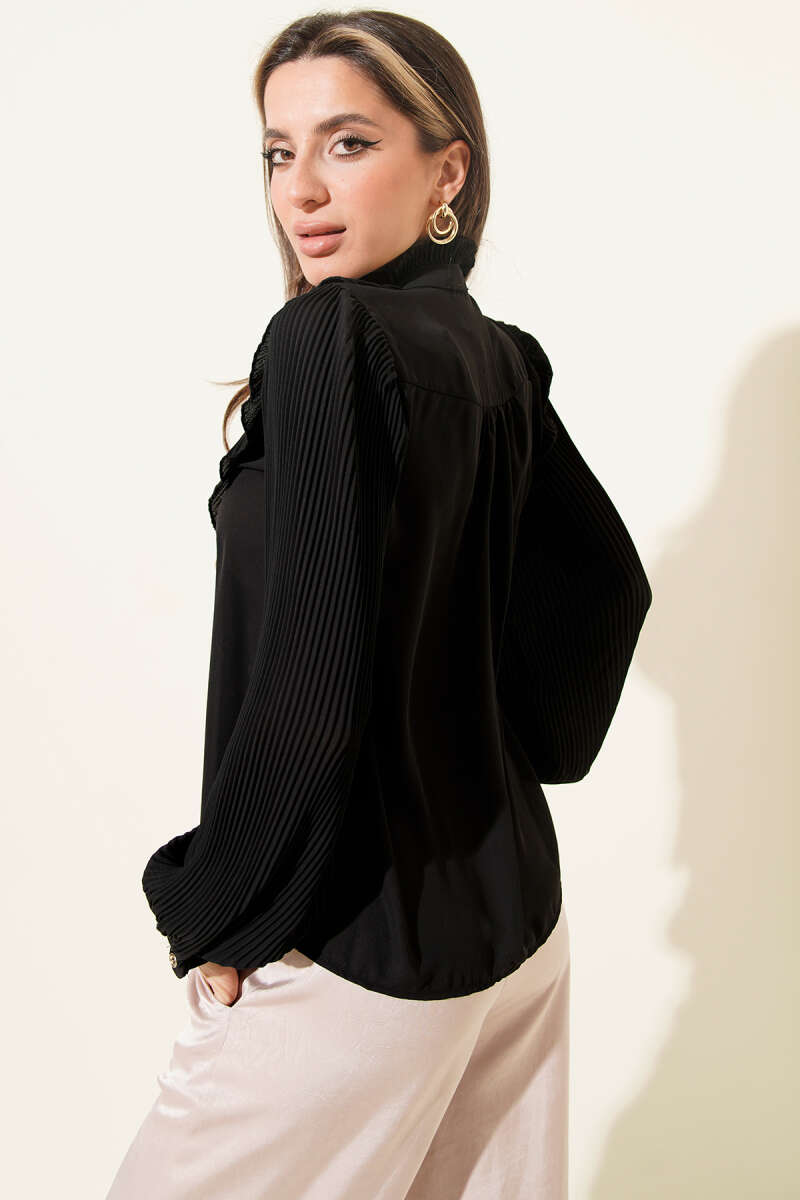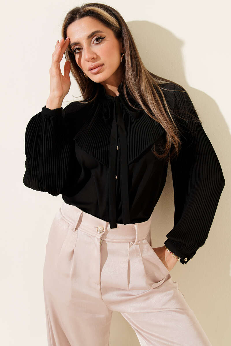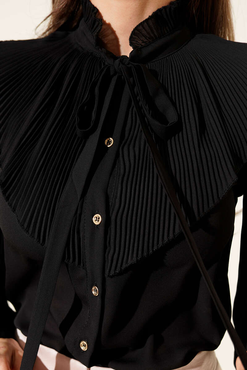 Yaka Bağlamalı Piliseli Kısa Gömlek Siyah