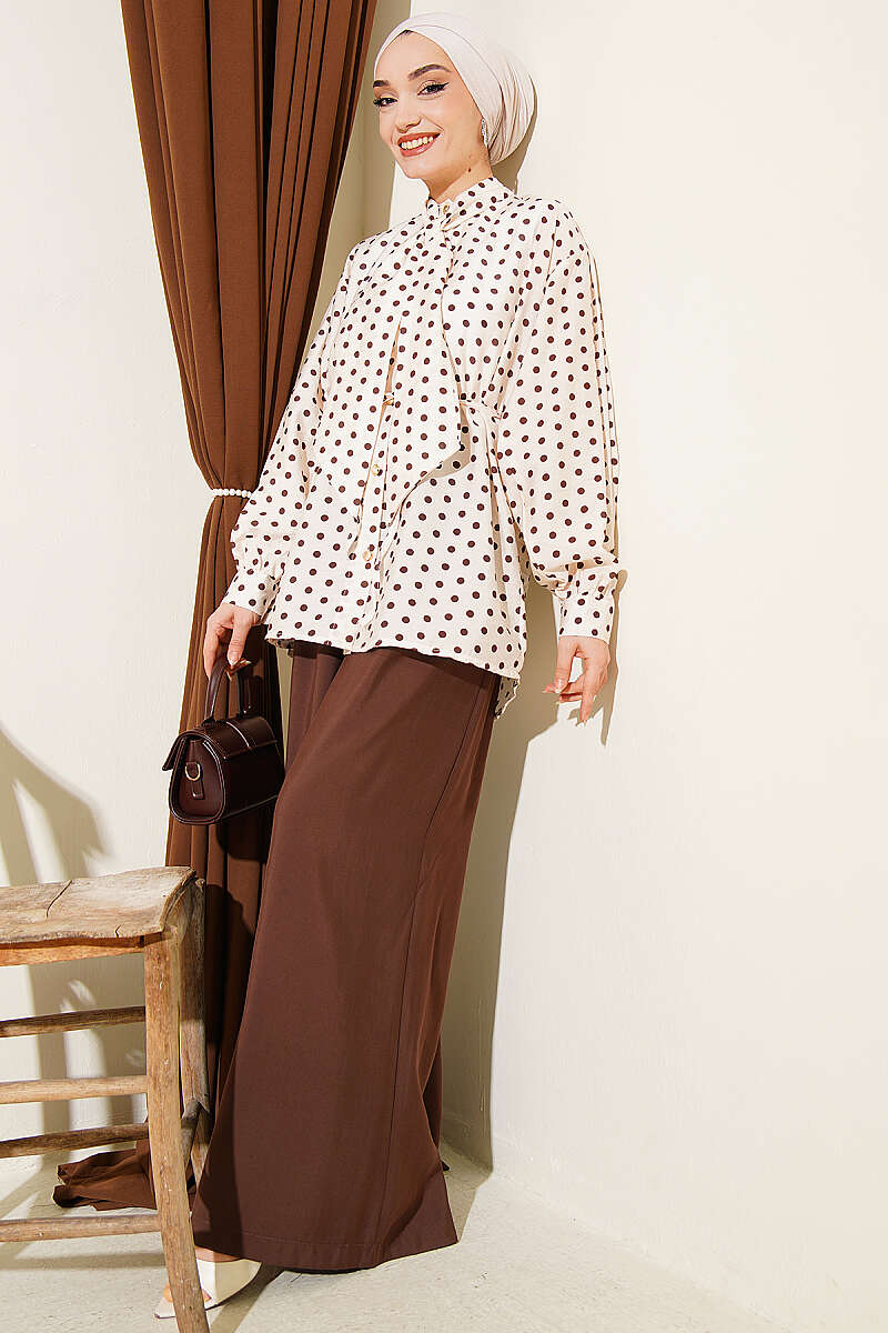Yaka Bağlamalı Puantiyeli Gömlek Acı Kahve