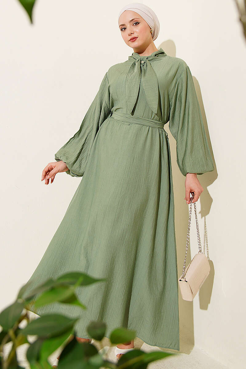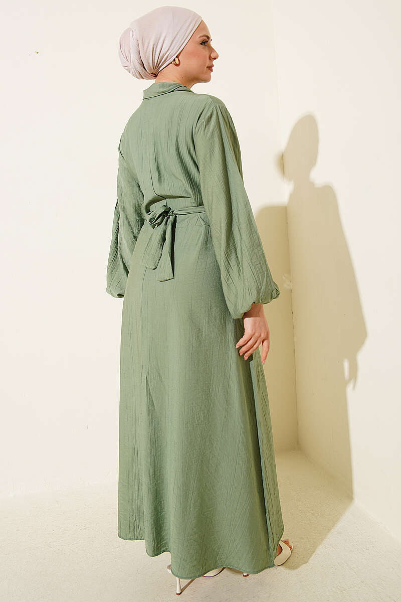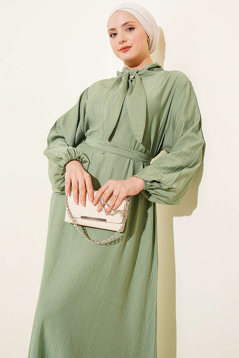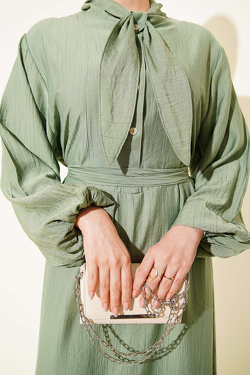 Yaka Bağlamalı Yarım Düğmeli Elbise Çağla Yeşili