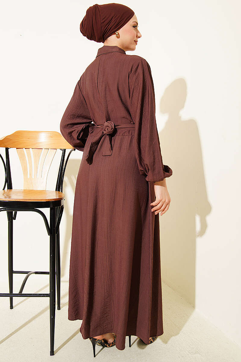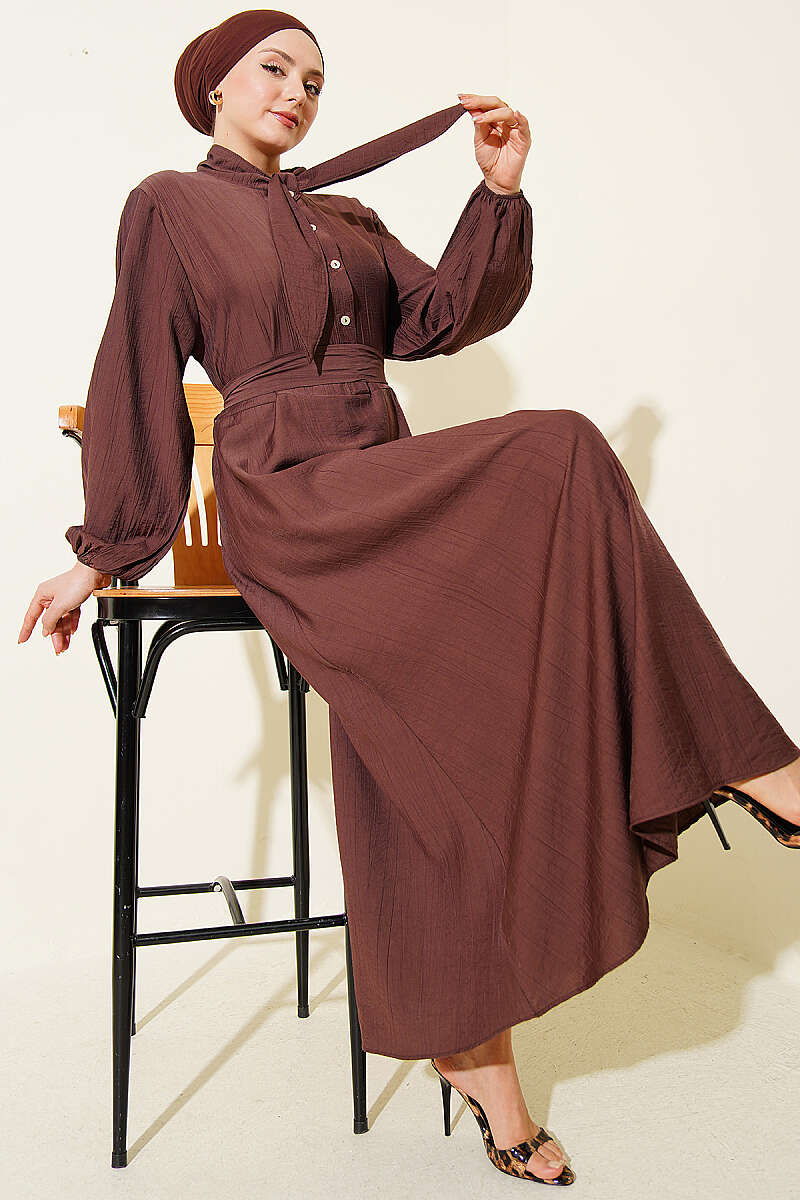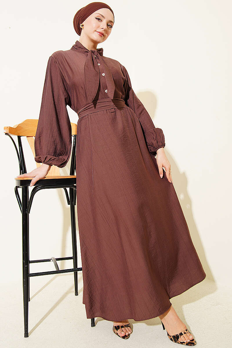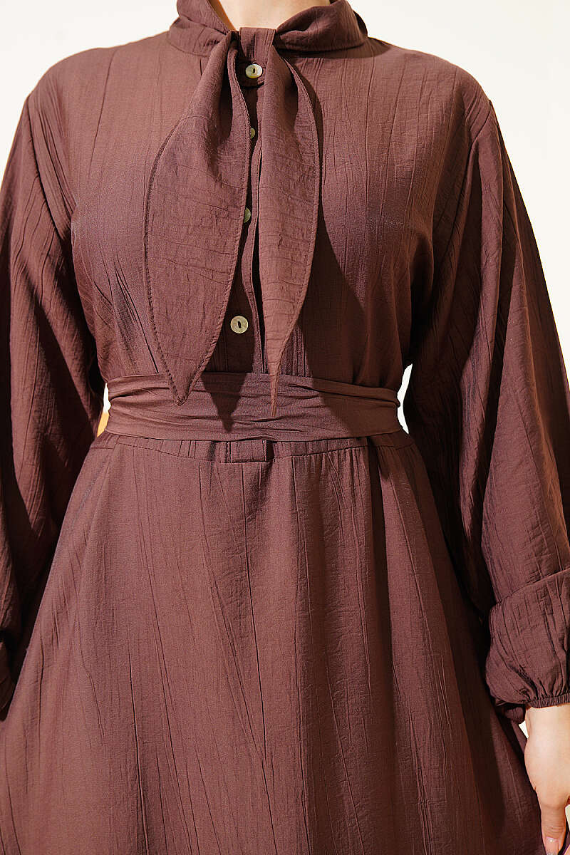 Yaka Bağlamalı Yarım Düğmeli Elbise Kahve