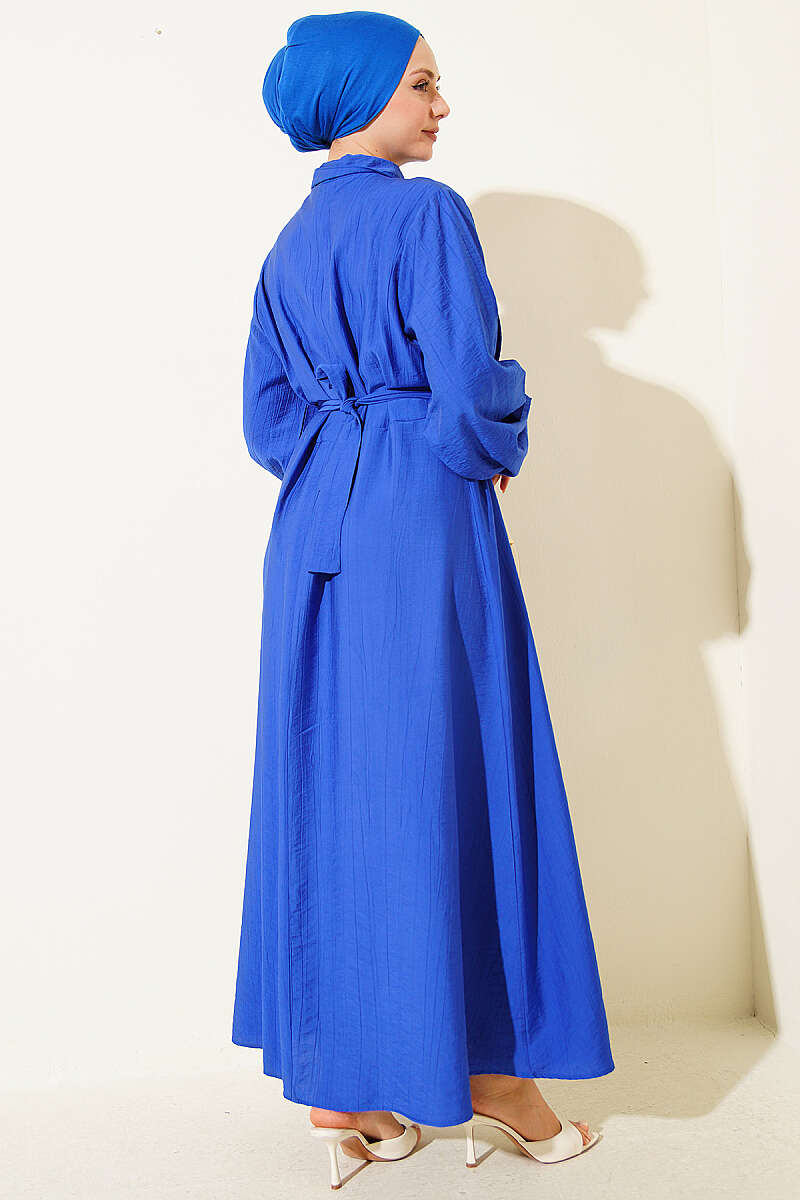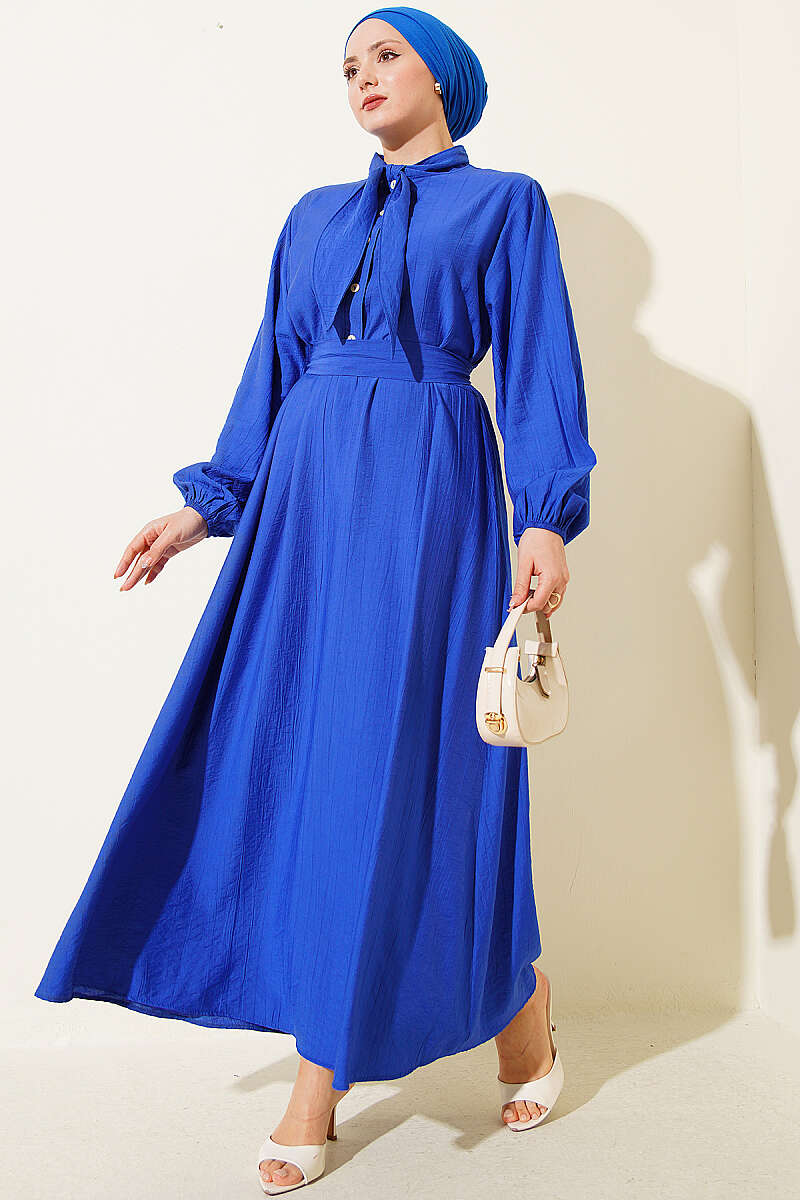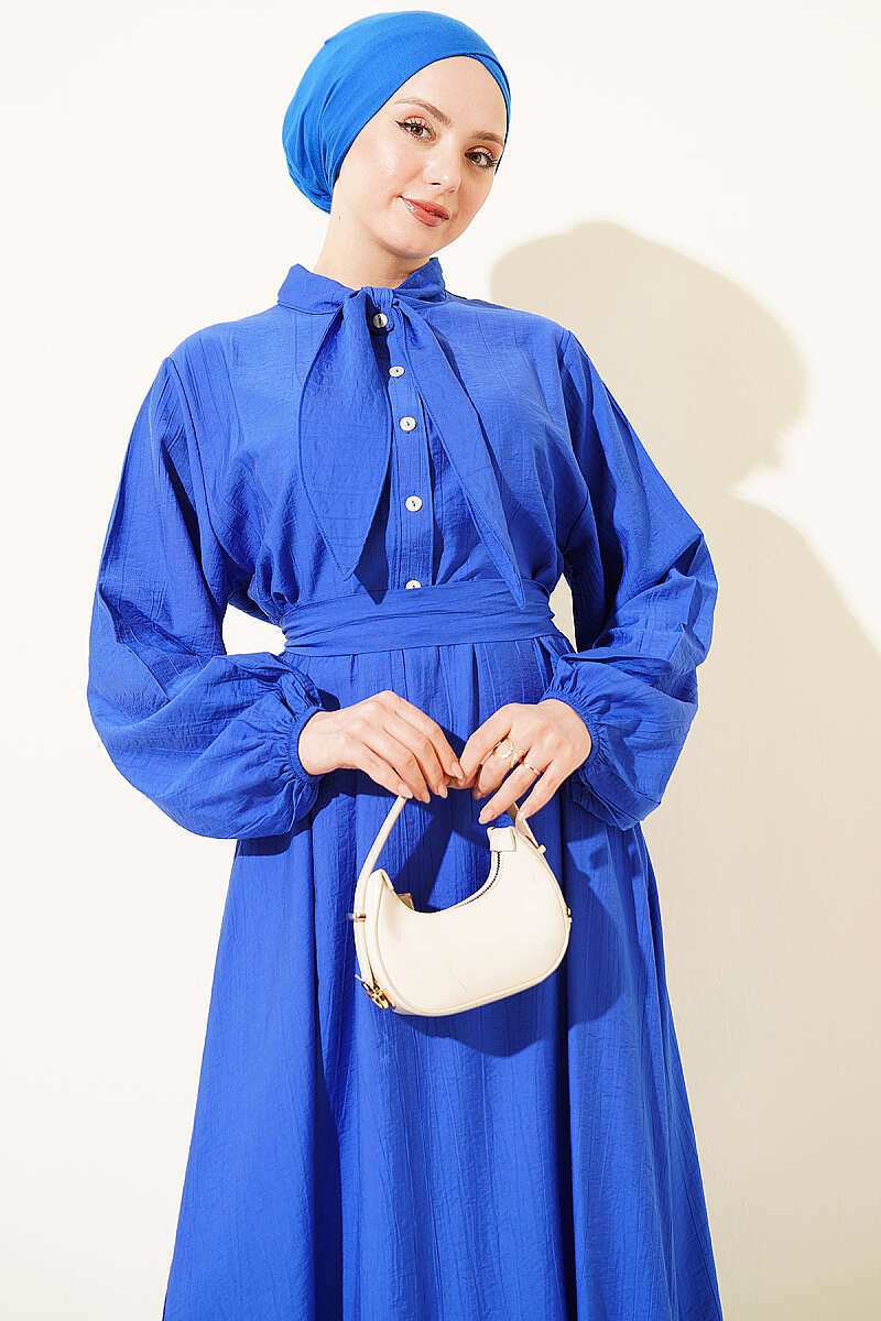 Yaka Bağlamalı Yarım Düğmeli Elbise Saks