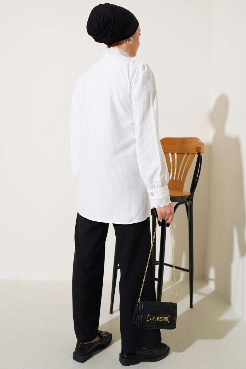 Yaka Bağlamalı Saten Gömlek Beyaz