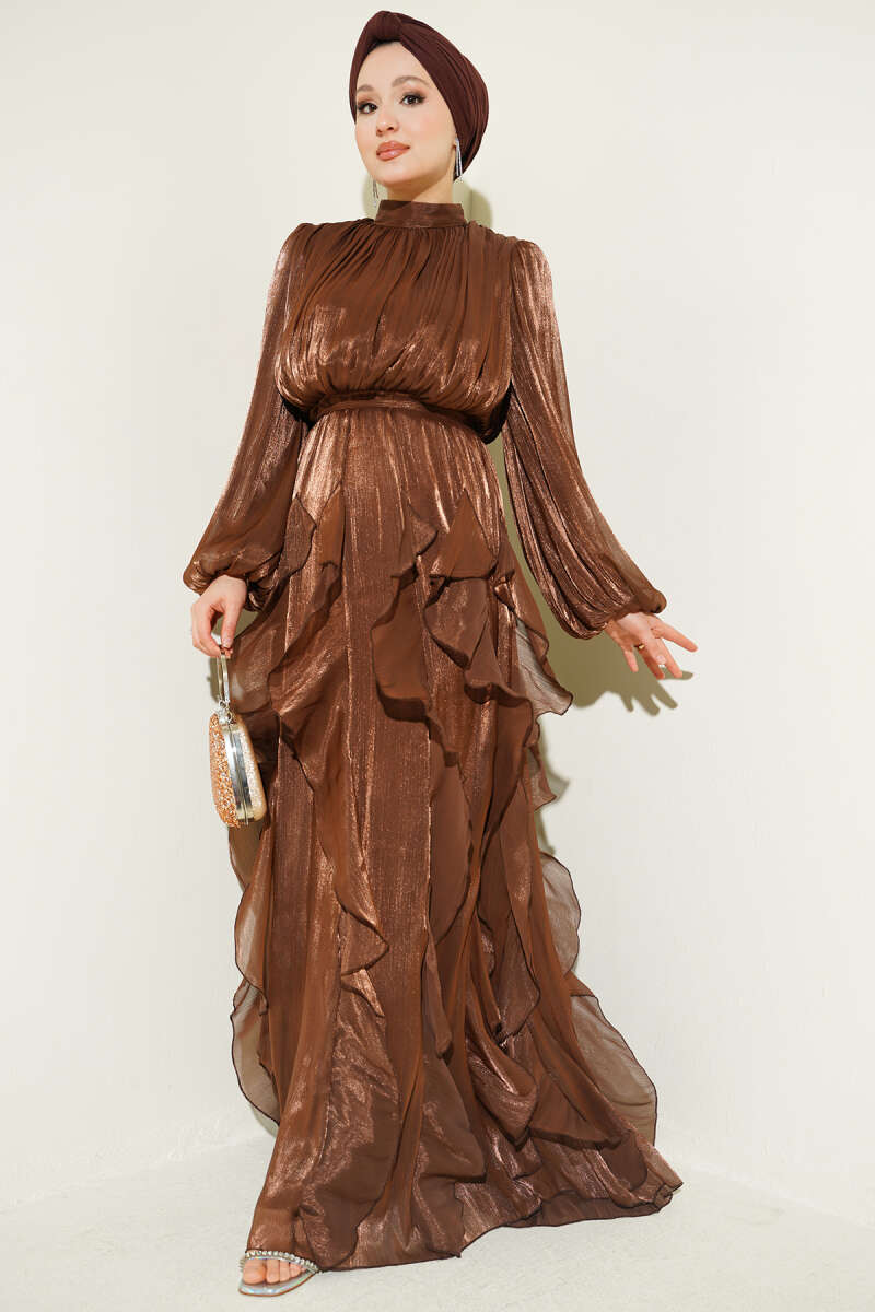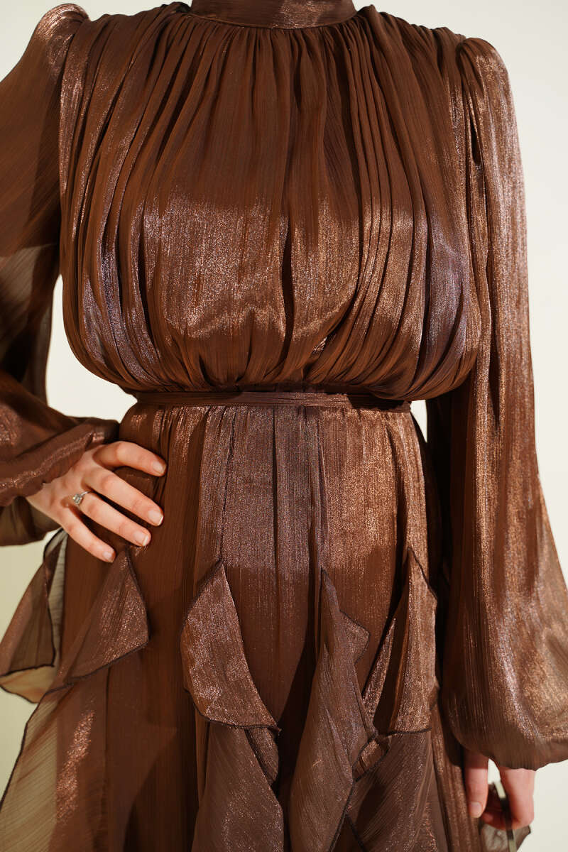 Balon Kol Beli Drapeli Abiye Elbise Kahve