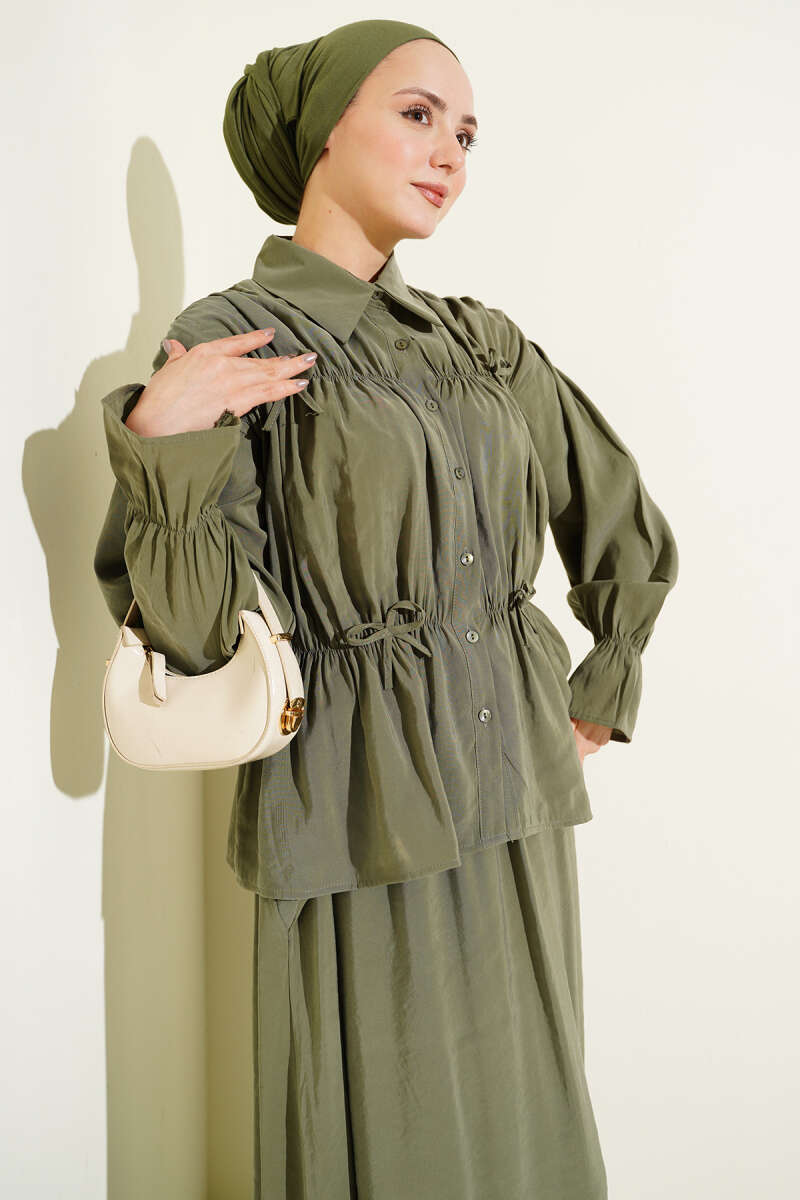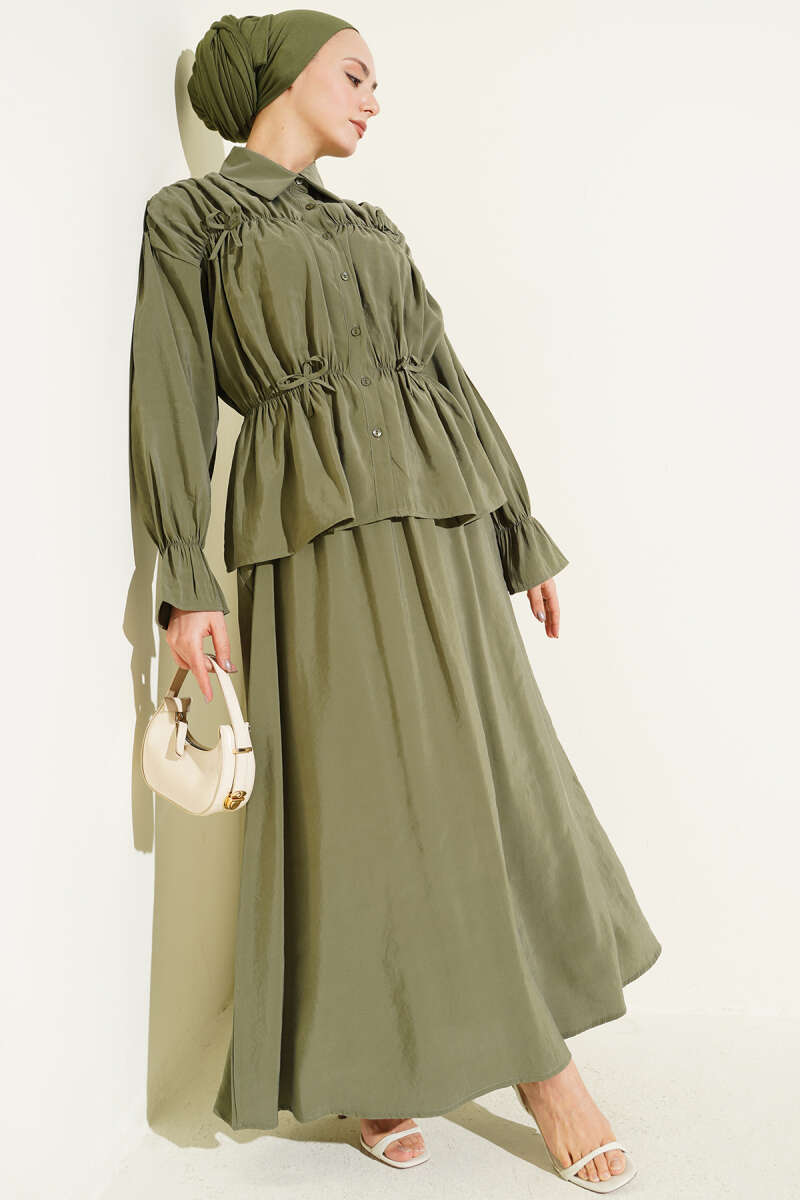 Yaka Büzgülü Fiyonklu Etekli İkili Takım Vizon