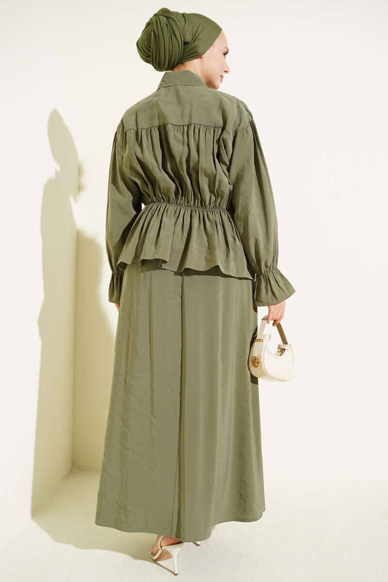 Yaka Büzgülü Fiyonklu Etekli İkili Takım Füme