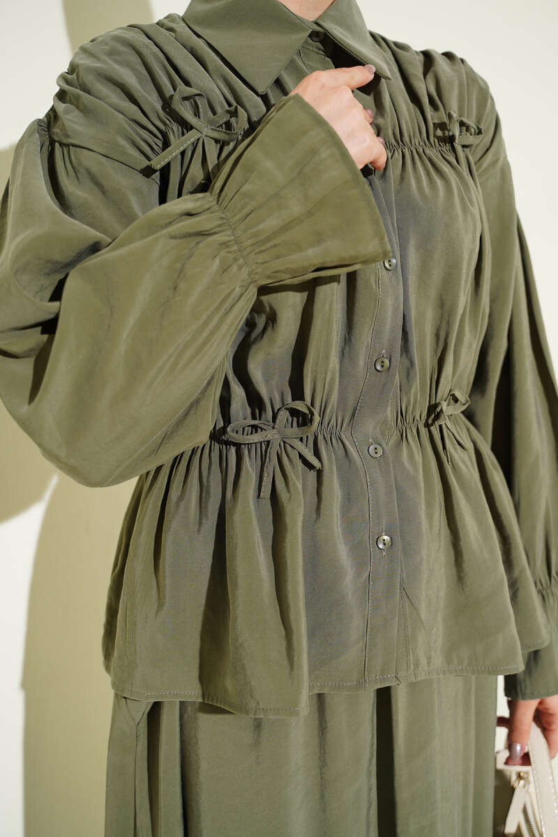 Yaka Büzgülü Fiyonklu Etekli İkili Takım Latte