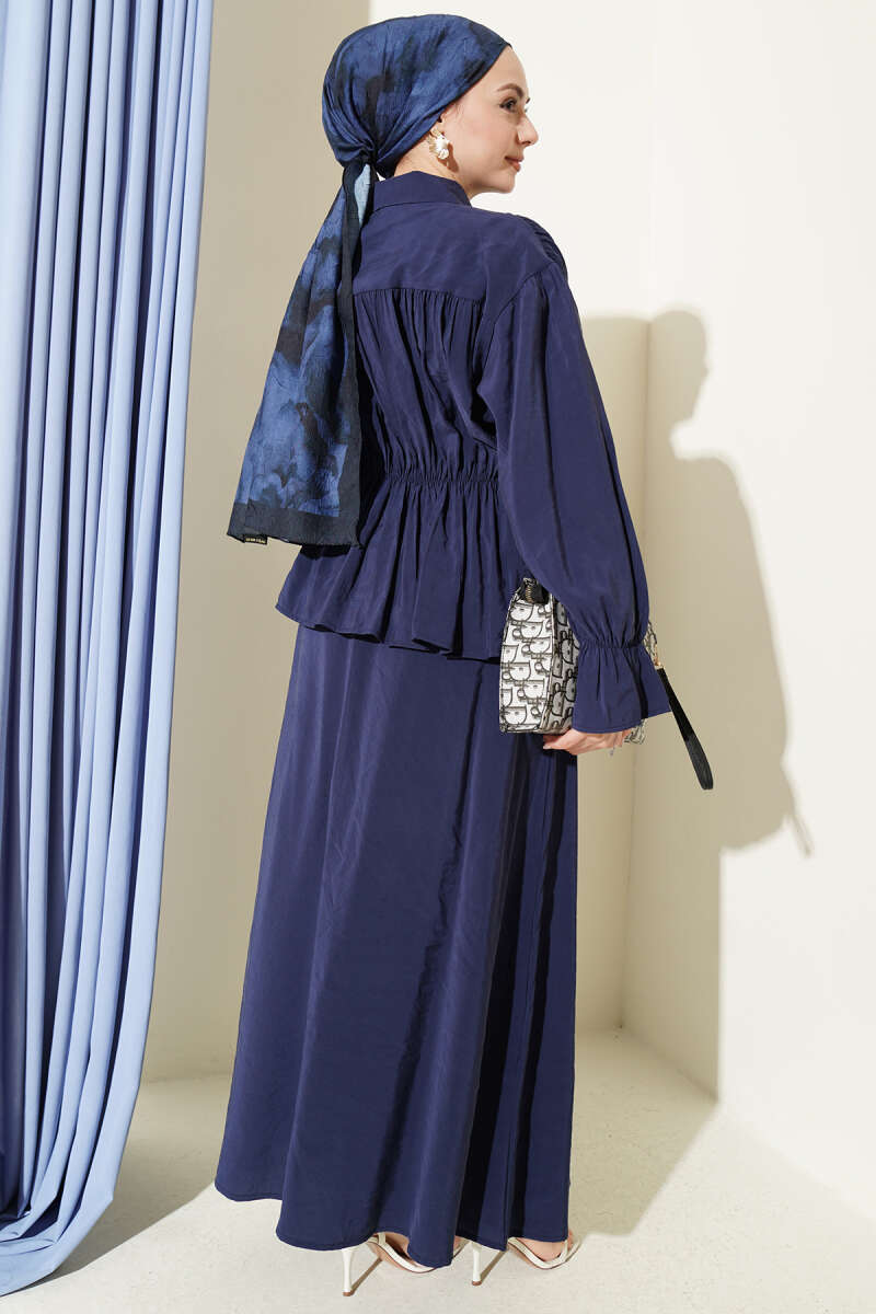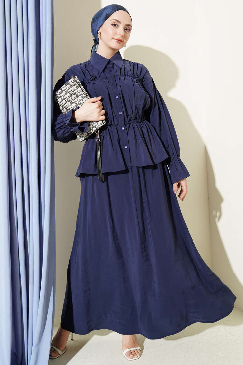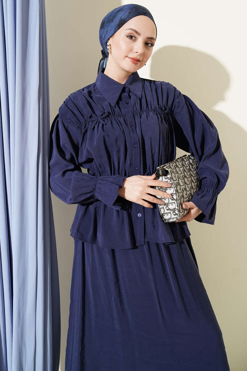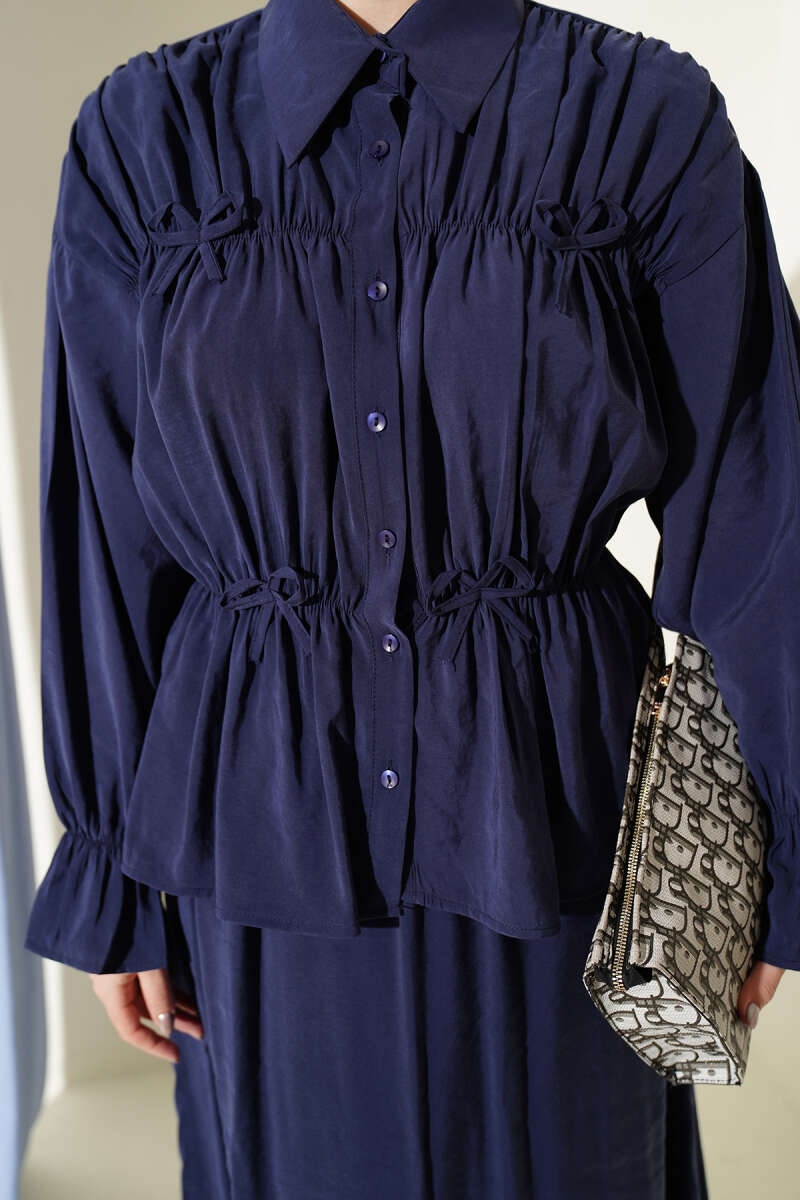 Yaka Büzgülü Fiyonklu Etekli İkili Takım Lacivert