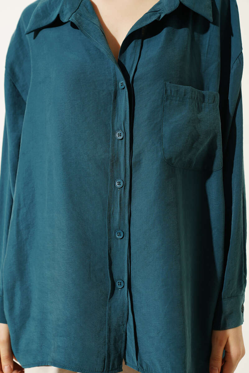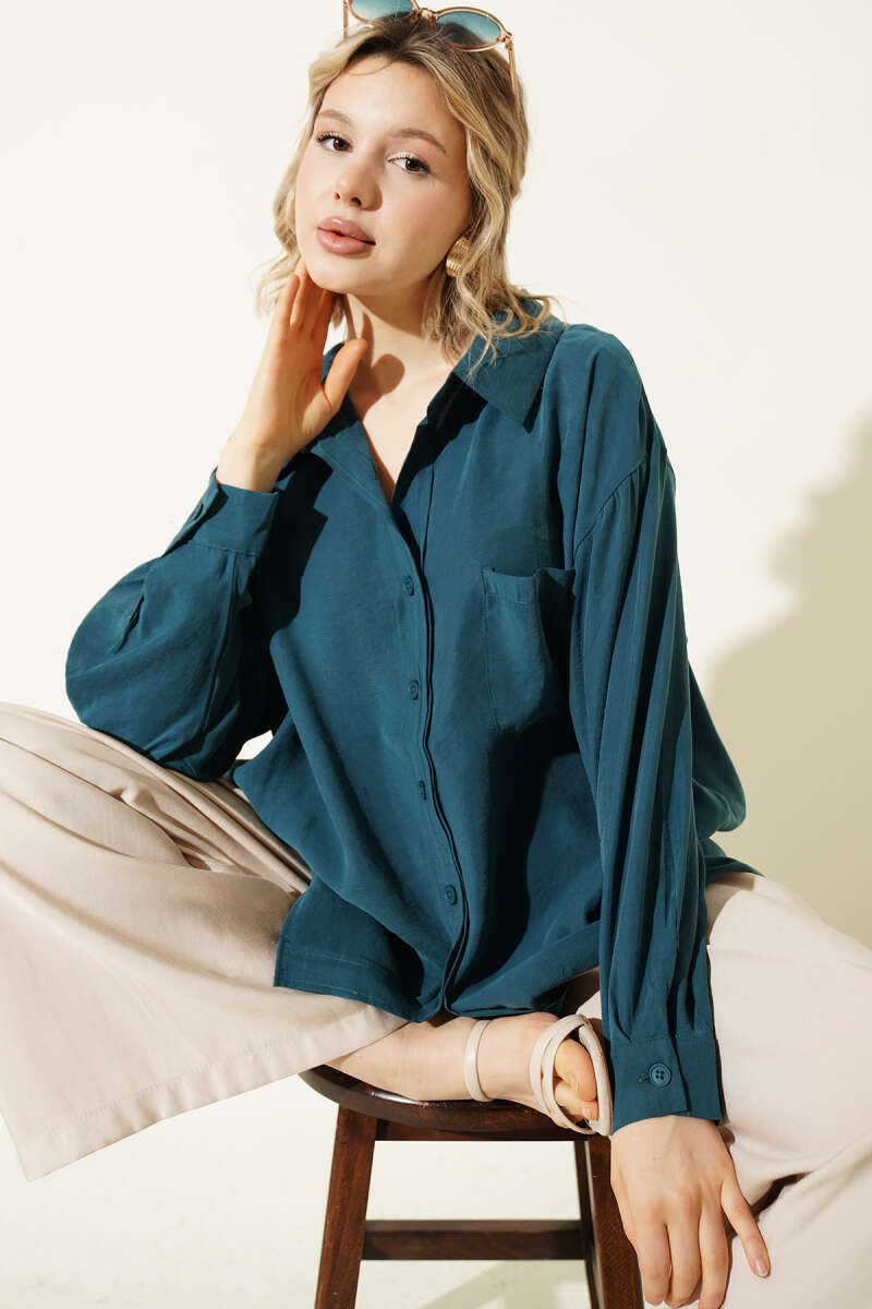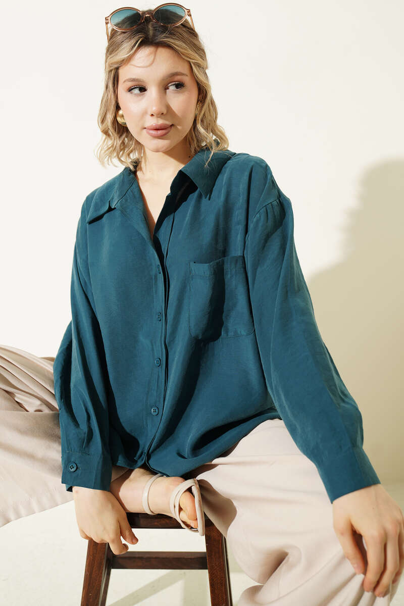 Yaka Cepli Oversize Gömlek Zümrüt